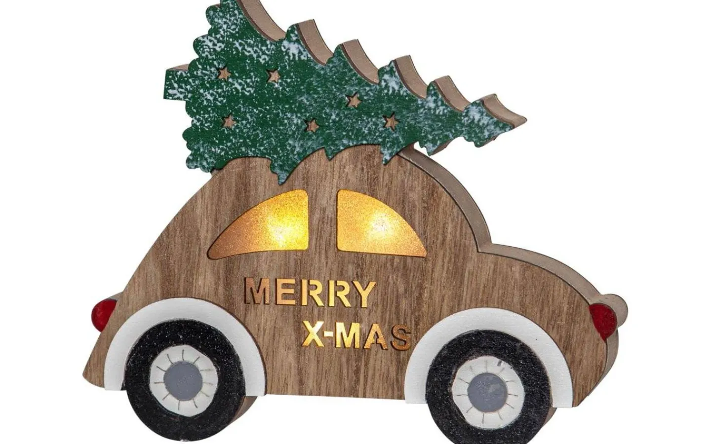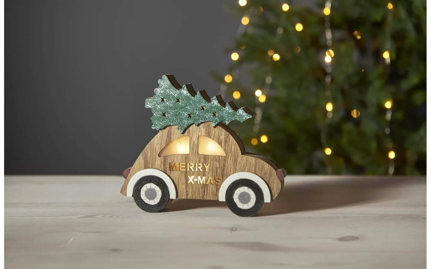 Batteridriven bil med gran på taket. Dekorationsfiguren har inbyggd LED som avger ett mysigt varmvitt sken. En härlig dekoration som sprider julstämning i hemmet!