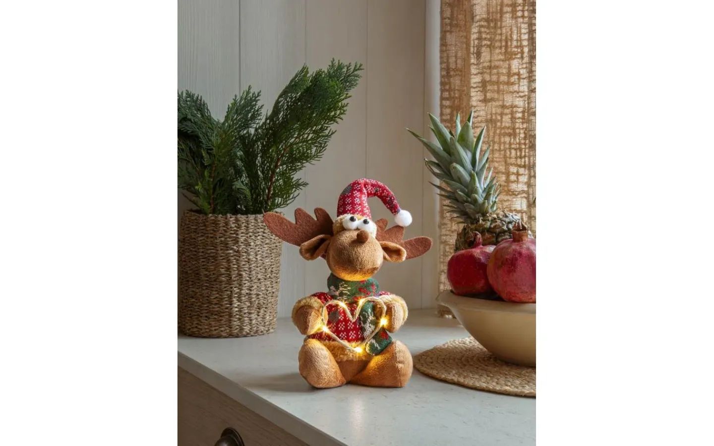 En mysig älg med julkläder som sprider värme och julkänsla. Hjärtat lyser fint med små ljuspunkter. Dekorera med till jul och advent. Drivs med batterier. 3 batterier AAA ingår ej. Batteritid ca. 95h.