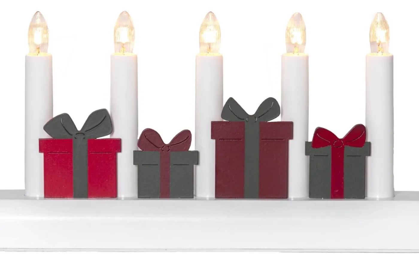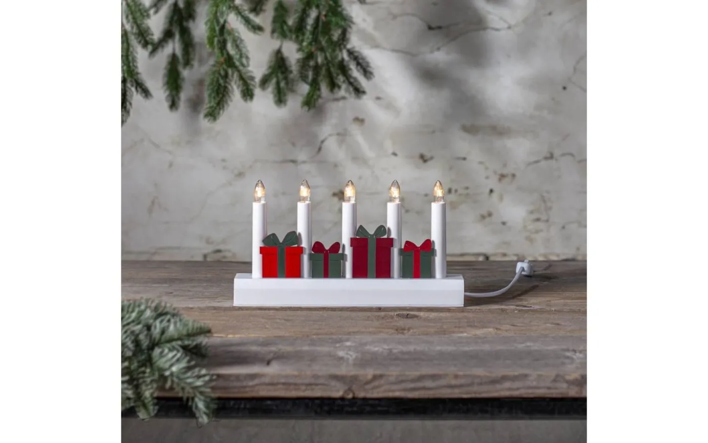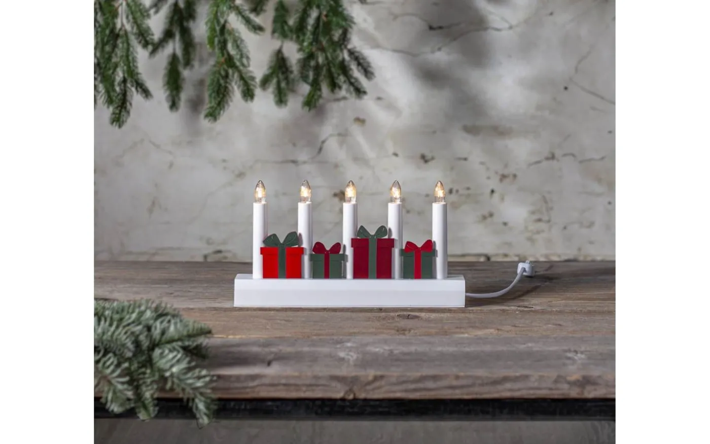 Julia adventsljusstake från Star Trading är en 5-armad vit träljusstake dekorerad med julklappar målade i julens färger.