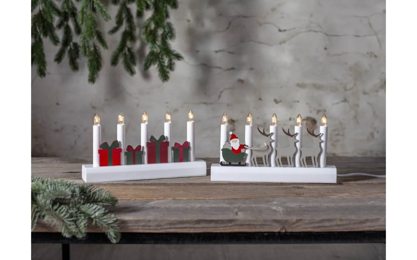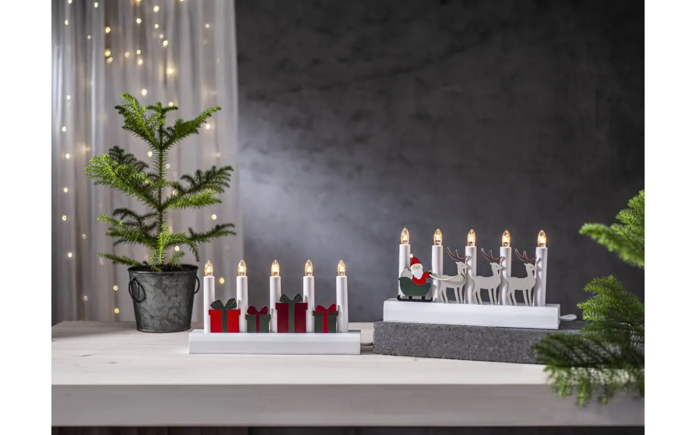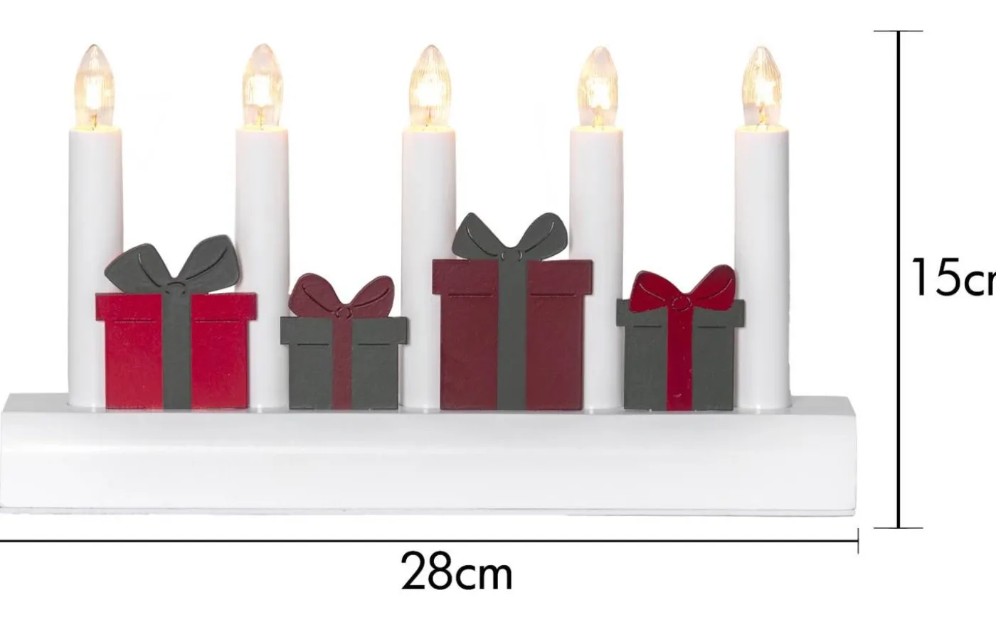 Julia adventsljusstake från Star Trading är en 5-armad vit träljusstake dekorerad med julklappar målade i julens färger.