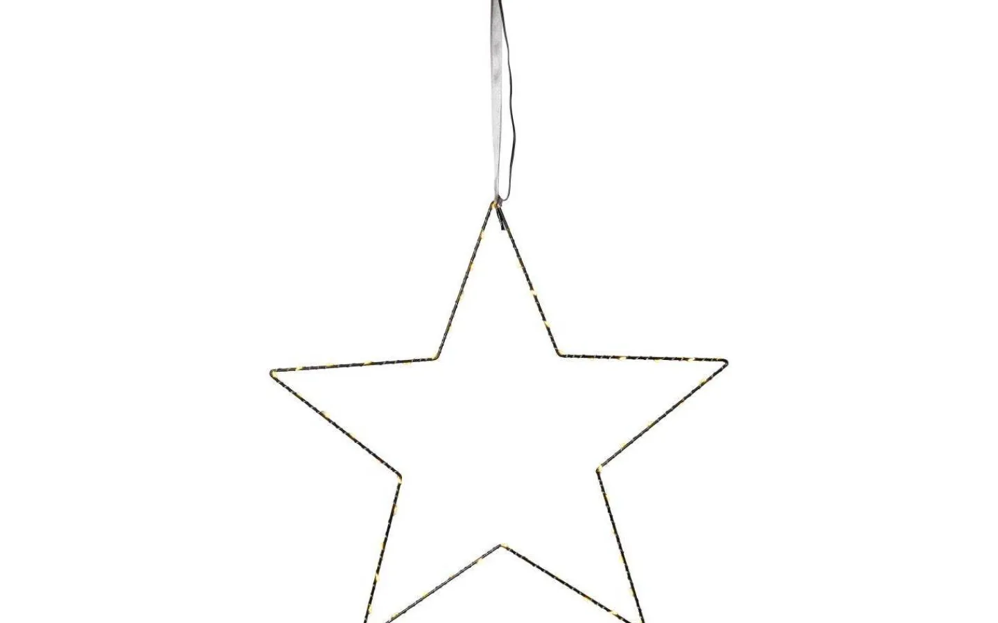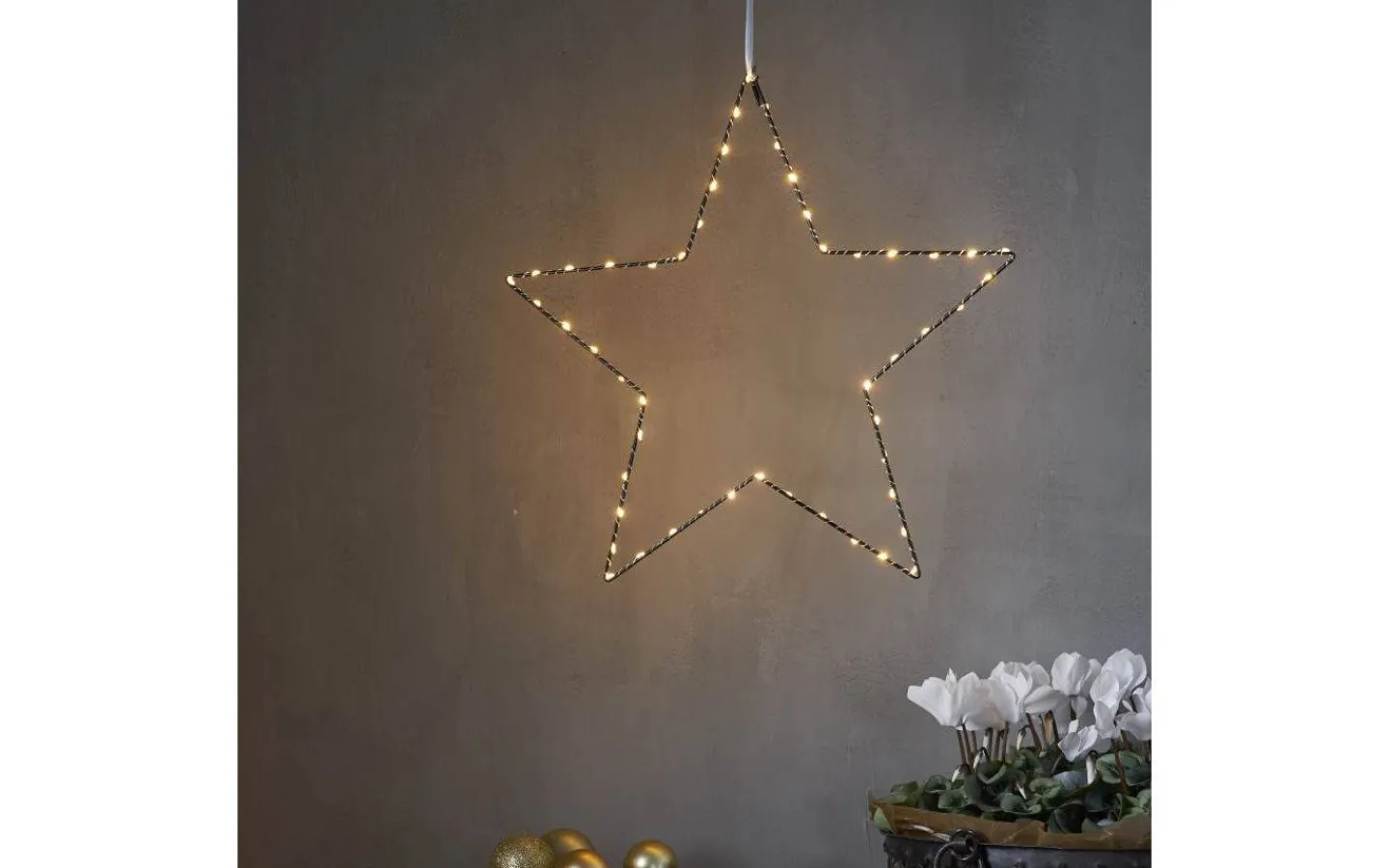 Dekorativ metallstjärna med dew drop ljusslinga för inomhusbruk. Stjärnan har 50 LED-ljuskällor med varmvitt sken. Fin dekoration att hänga i fönstret och på väggen.