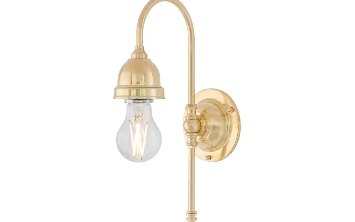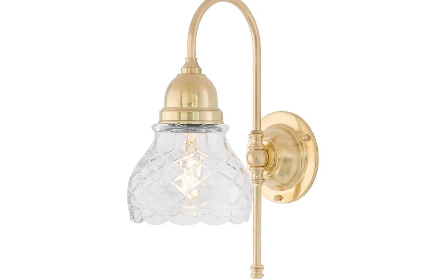 Klassisk väggarmatur för en öppen glasskärm. Placeras lämpligen på var sin sida om en badrumsspegel. Det nedre stagen kan avlägsnas om man vill montera lampan ovanför exempelvis en spegel. För fast montage. För att gå in med kuloledning kompletteras med en distansplatta.