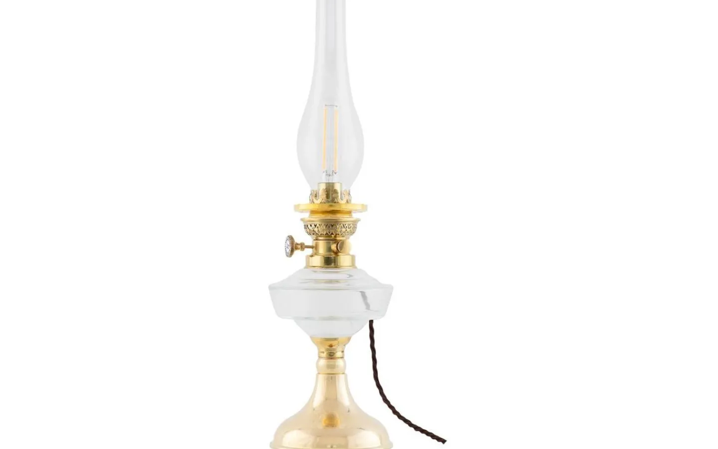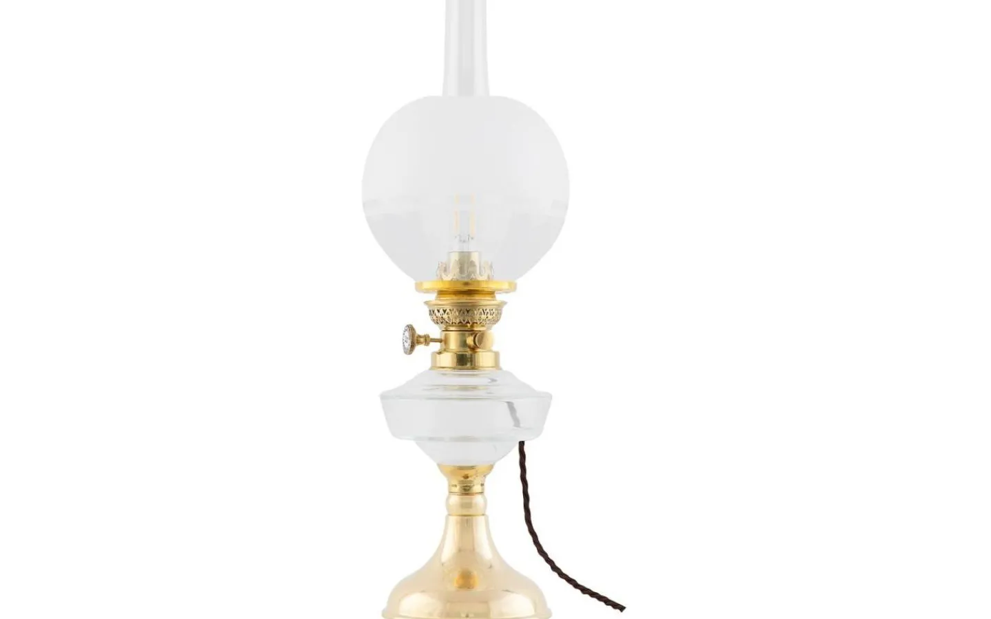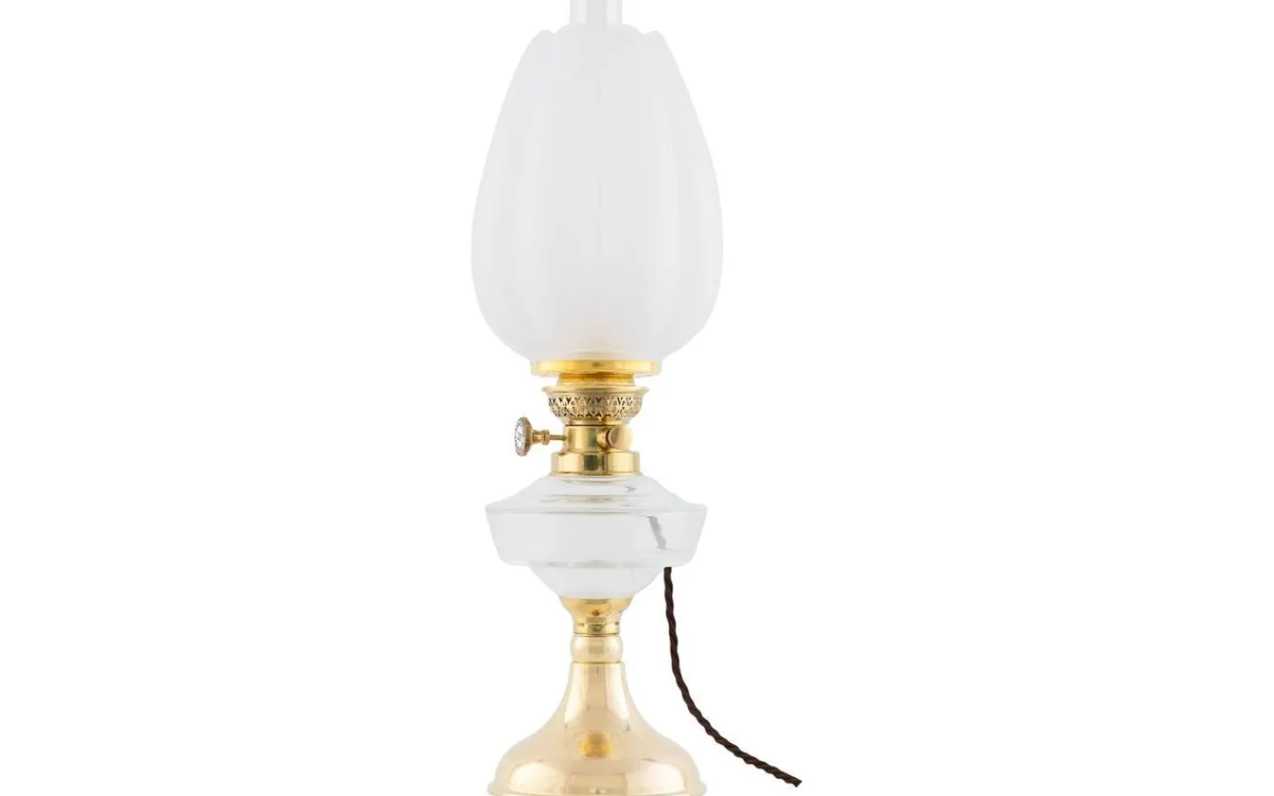 En elmonterad fotogenlampa med oljehus i klarglas som med sin enkla vackert böljande fot, är en riktig klassiker som i sitt originalutförande funnits med i vårt sortiment sedan 1890-talet.