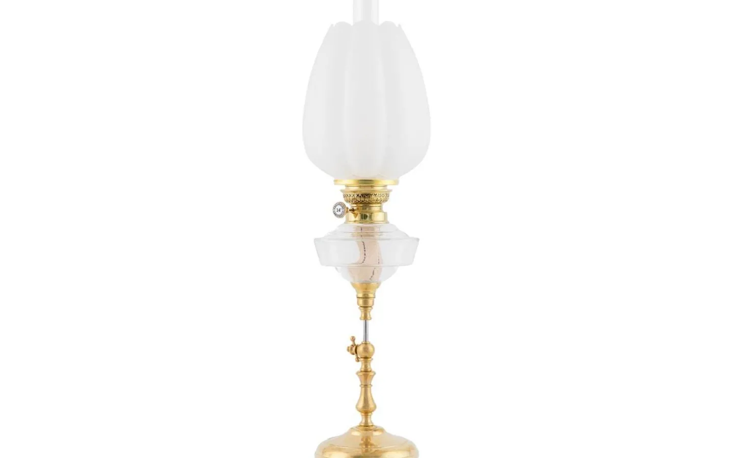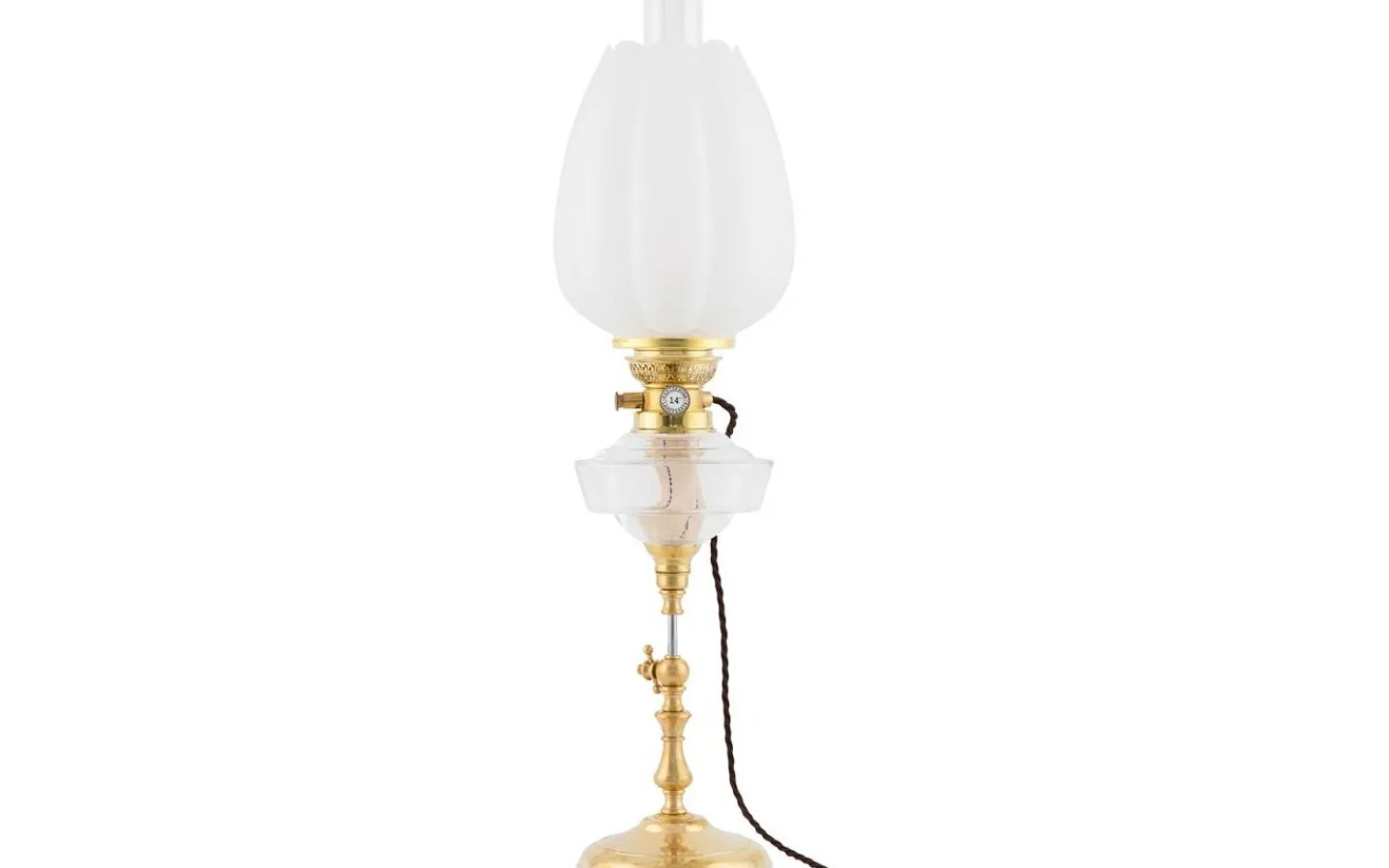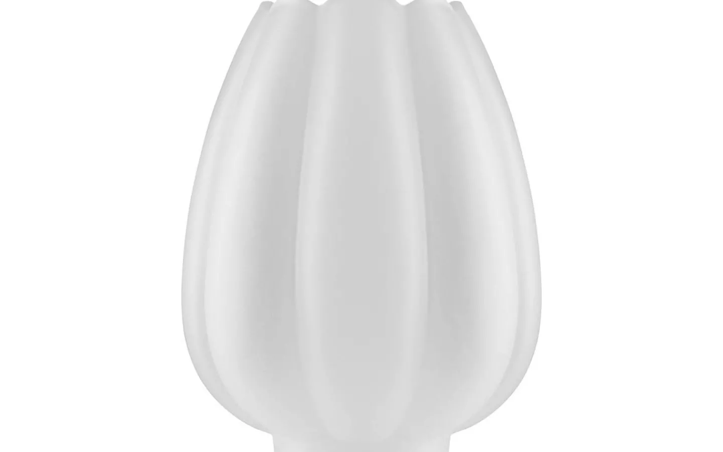 Klassisk fotogenkupa i tulpanform. Formar med mönstrad yta är avsevärt mycket mer kostsamma att formge och tillverka än vanliga rotationssymmetriska lampkupor. Den övre kanten är hanslipad för att får den rätta vågiga tulpanformen. Mattblästrat klarglas 21×17 cm 85 +-1 mm