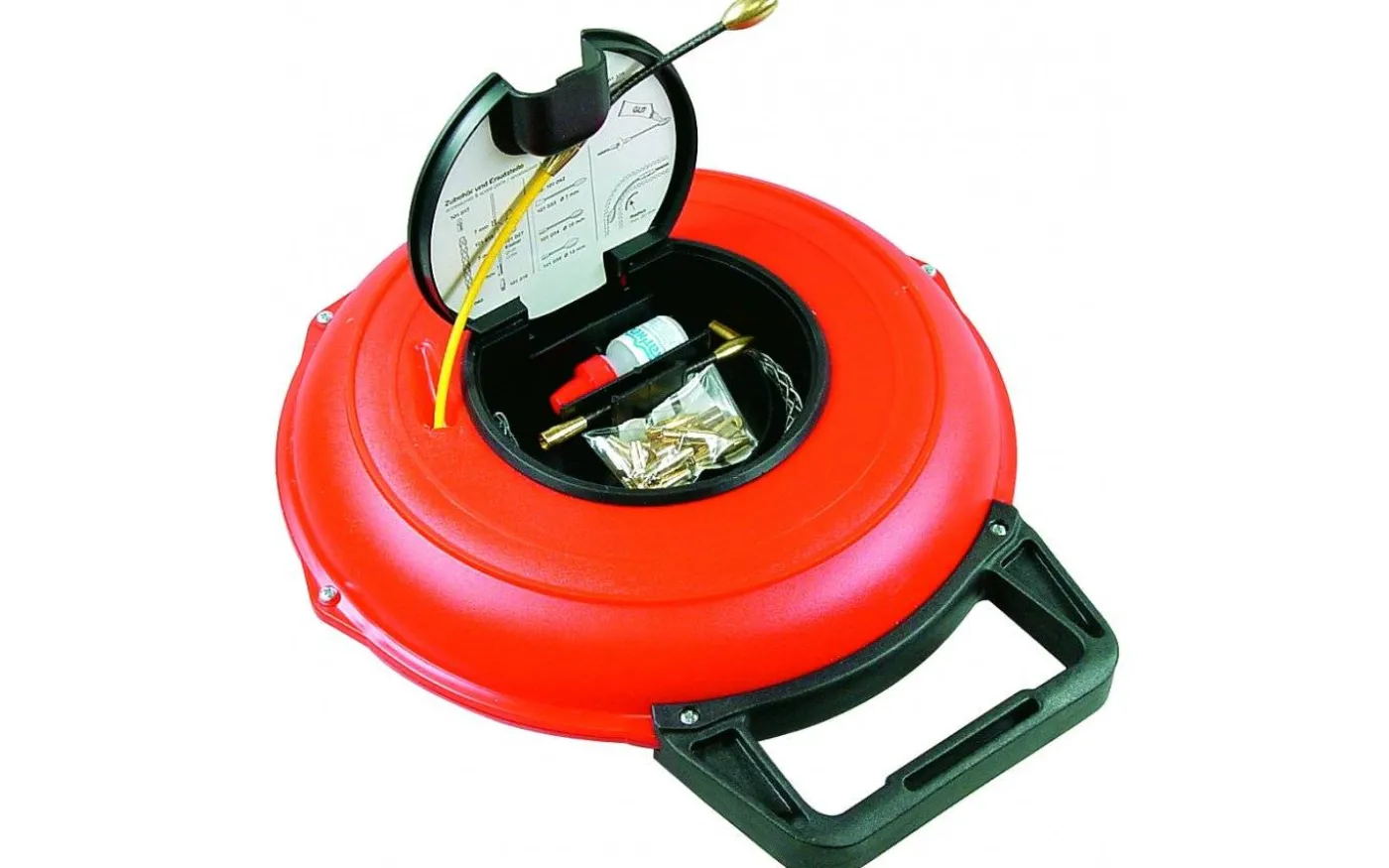 fastna. Setet innehåller allt som behövs för tråddragning. Glasfiberfjädern är förpackad i diskus med praktiskt bärhandtag och fack för tillbehör.