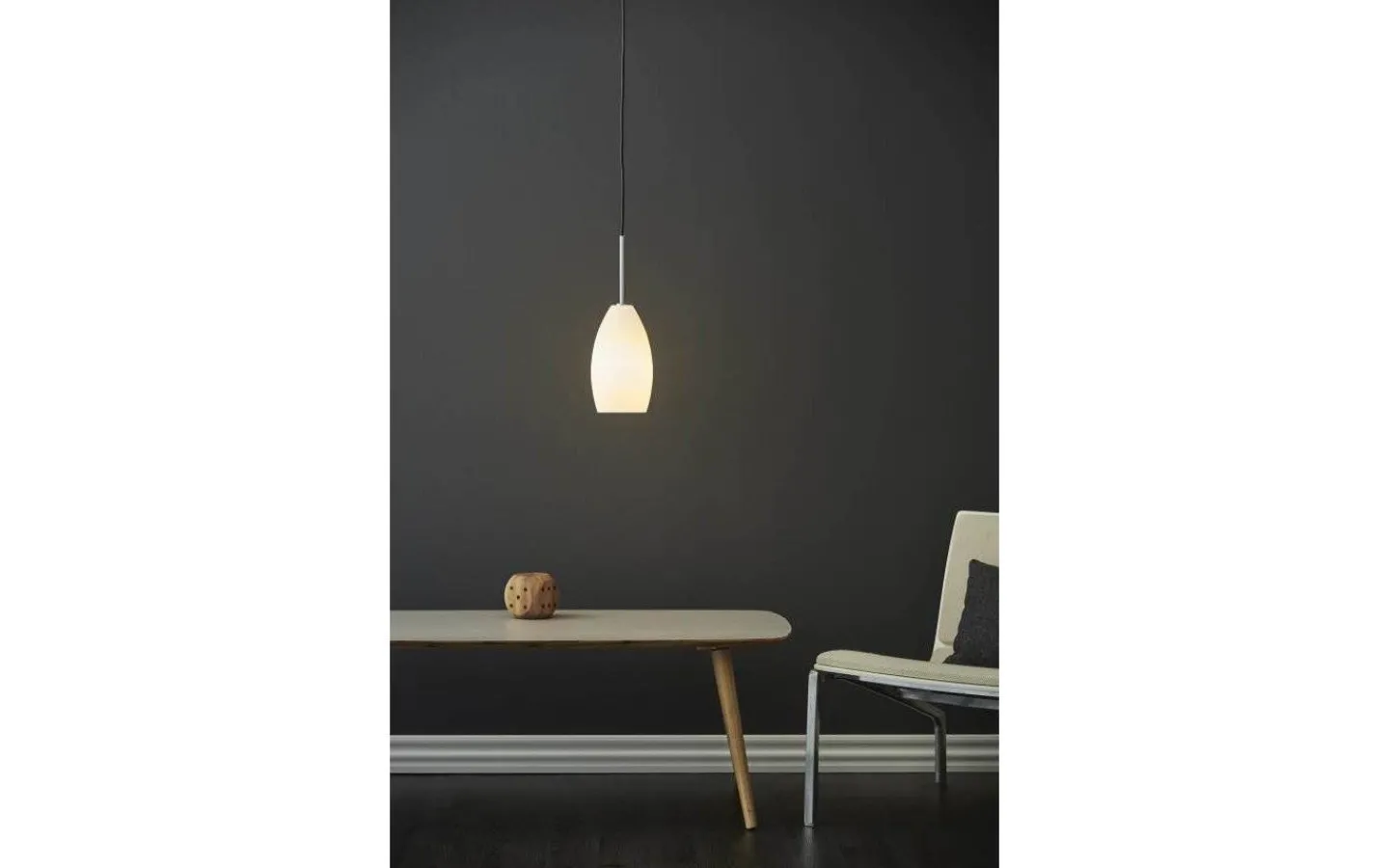 Stilren glaspendel, från danska Herstal, med skärm i opalvitt glas och detalj i kromfärgad metall. Med sin diameter på 14 cm passar denna vackra pendel lika bra singel i fönstret som i par över en köksö.