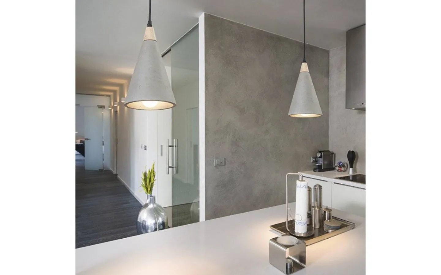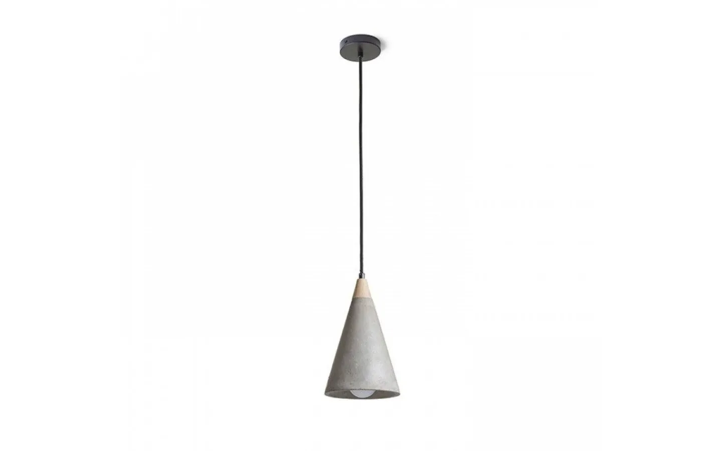Konformad pendel av betong, med topp av trä, textilkabel och E27-sockel.