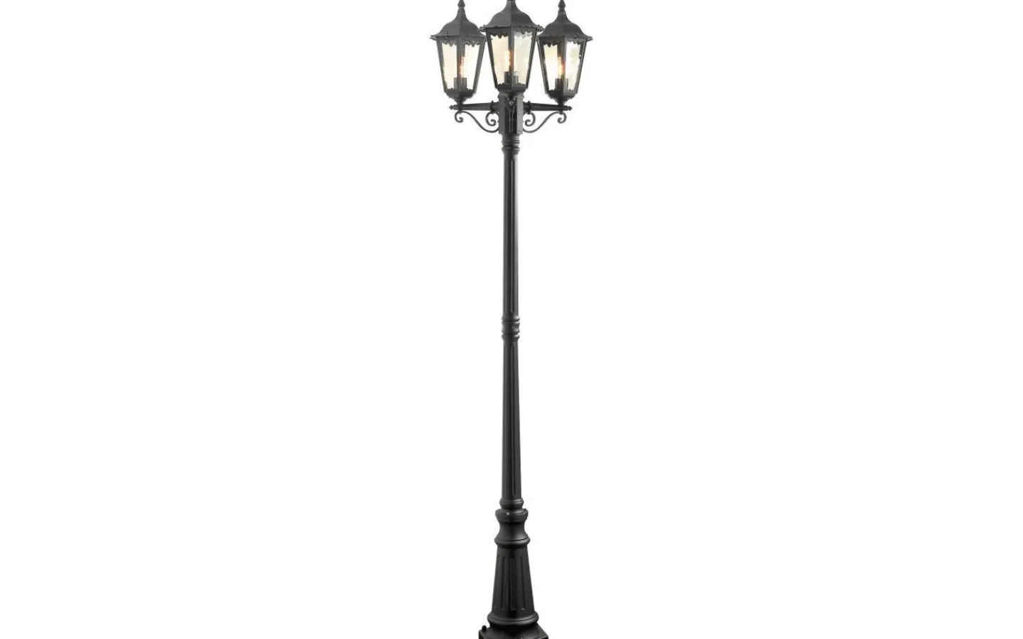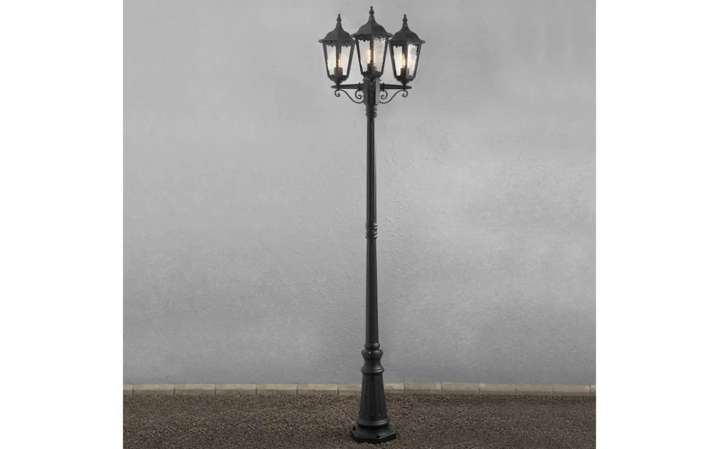 Klassiskt vacker stolplykta från välkända Konstsmide gjord av lackerad aluminium och klarglas. Gör sig lika vacker i en rabatt, på en gångstig eller på en gårdsplan. Stolpen har snygga infällda linjer och tre vackra lyktor med fina detaljer och klarglas.