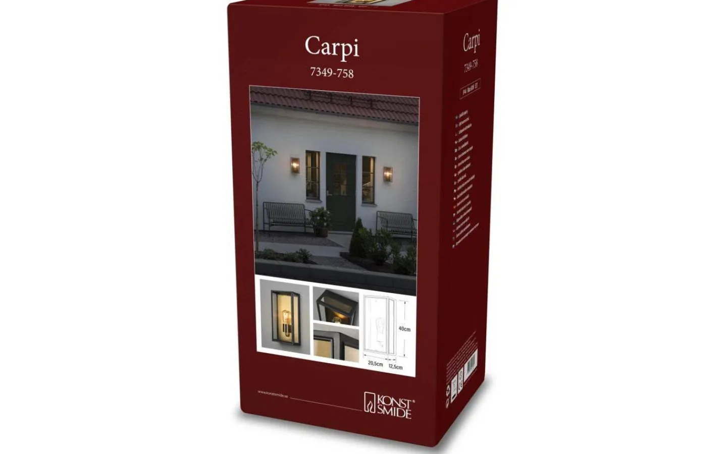 Carpiär en modern och stilfull vägglykta från välkända Konstsmide. Vägglampan är gjord av metall med klart glas som avger en vacker ljusspridning både framåt och åt sidorna. Installeras smidigt med 230V.