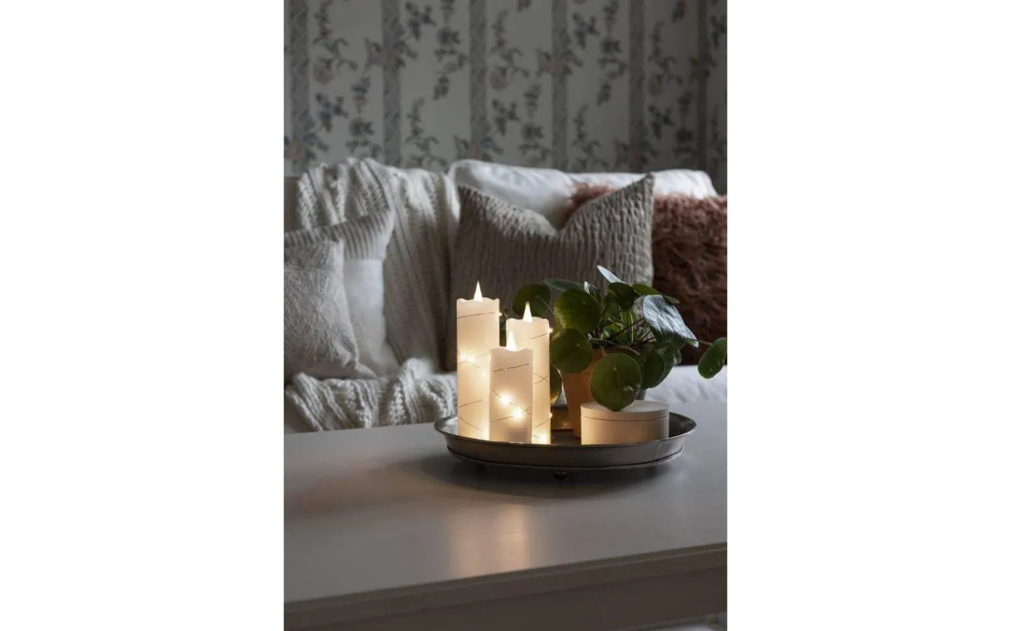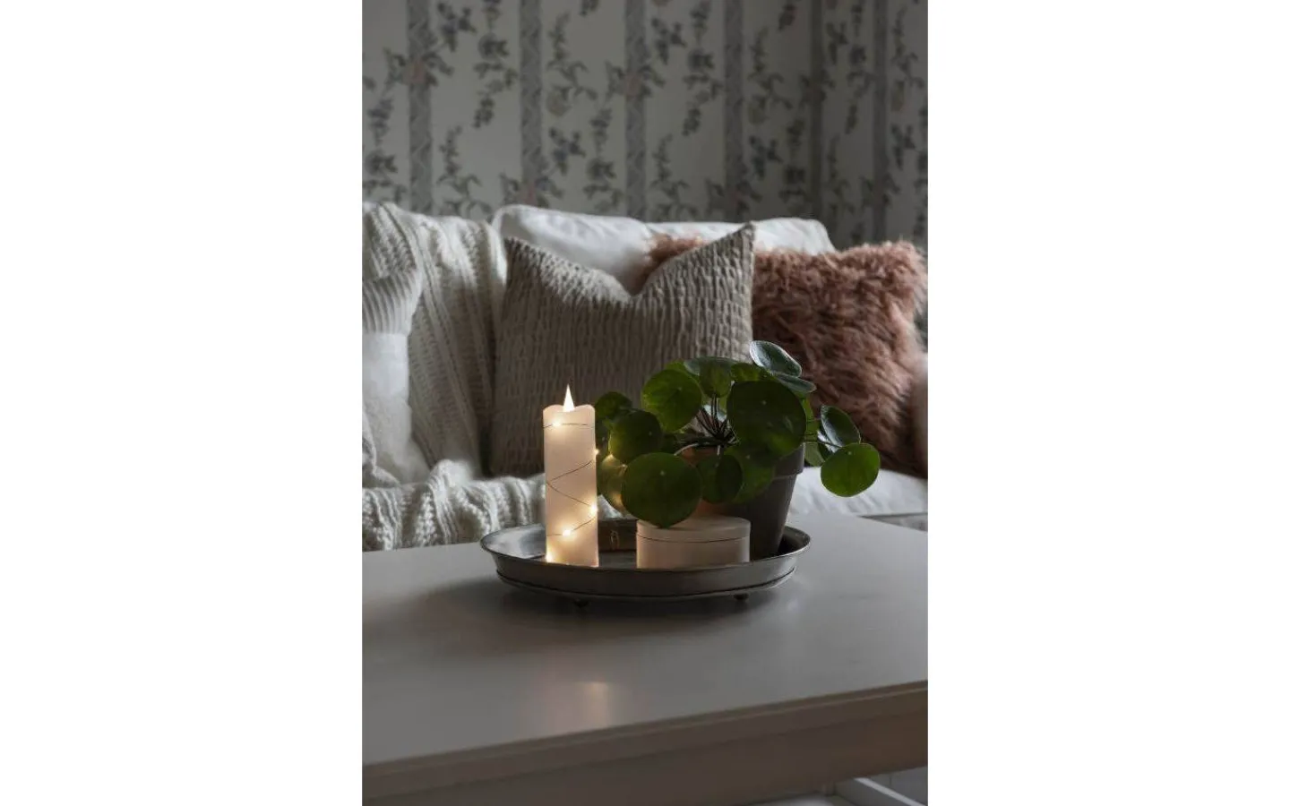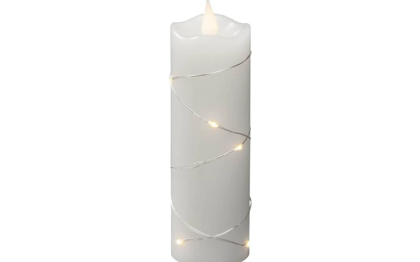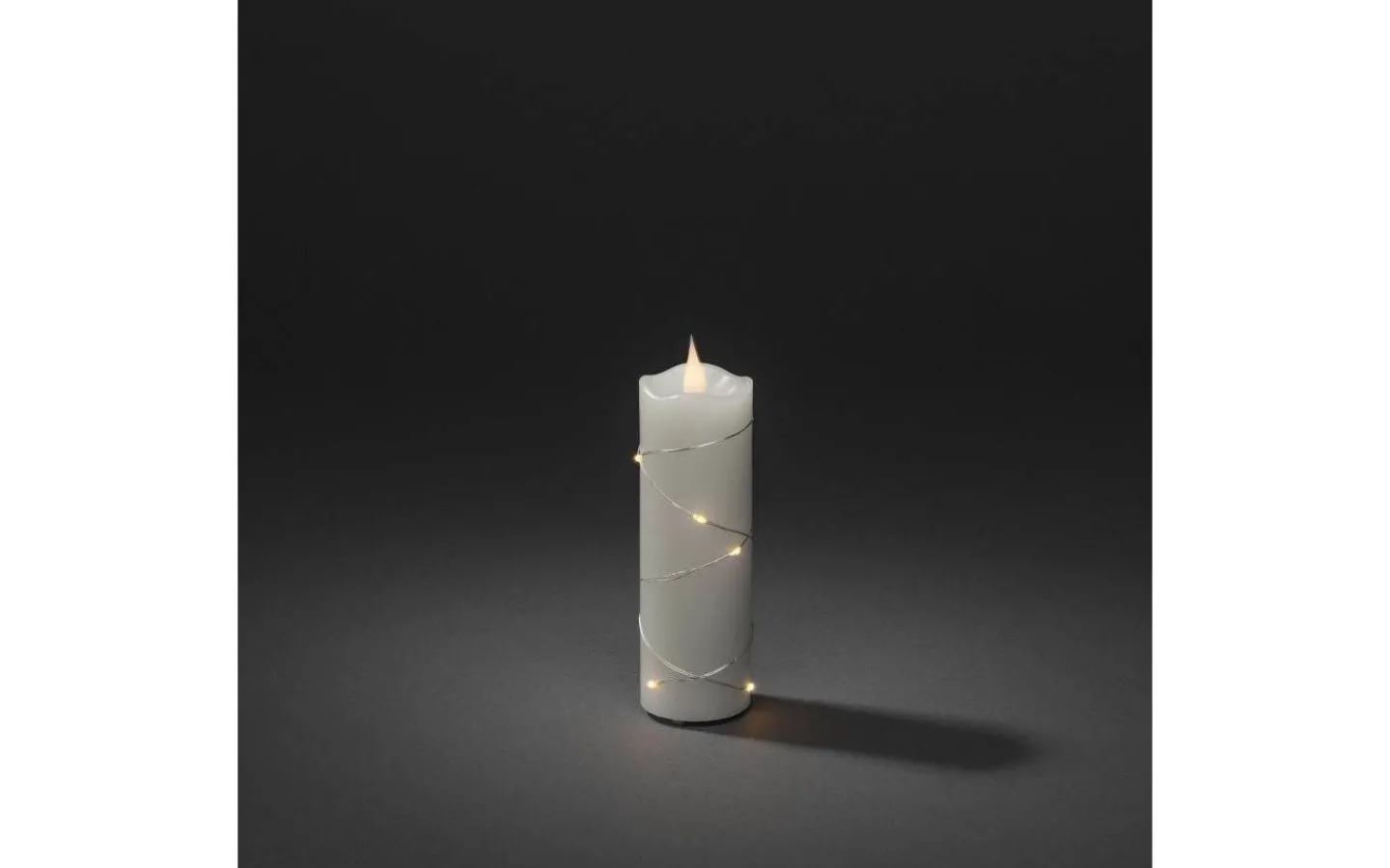 Deep blockljus från Konstsmide är i vax med vit låga som lyser i ett mysigt varmvitt ljussken. Runt det fina blockljuset ligger en ljusslinga med små LED-punkter som även dem lyser upp i ett härligt varmvitt ljussken.