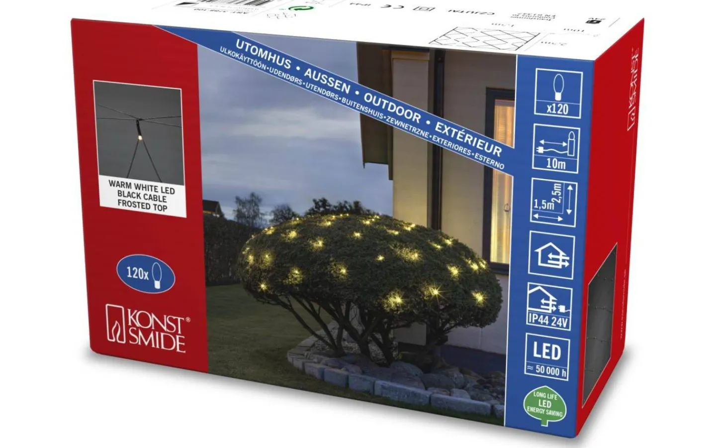 Vackert ljusnät från välkända Konstsmide. Ljusnätet är 2,5×1,5m och är försedd med 120st frostade LED-lampor som lyser upp i ett härligt varmvitt ljussken. Med sin IP44-klassning är ljusnätet väl anpassad för utomhusbruk och passar perfekt att sätta på en mindre buske eller trädkrona.