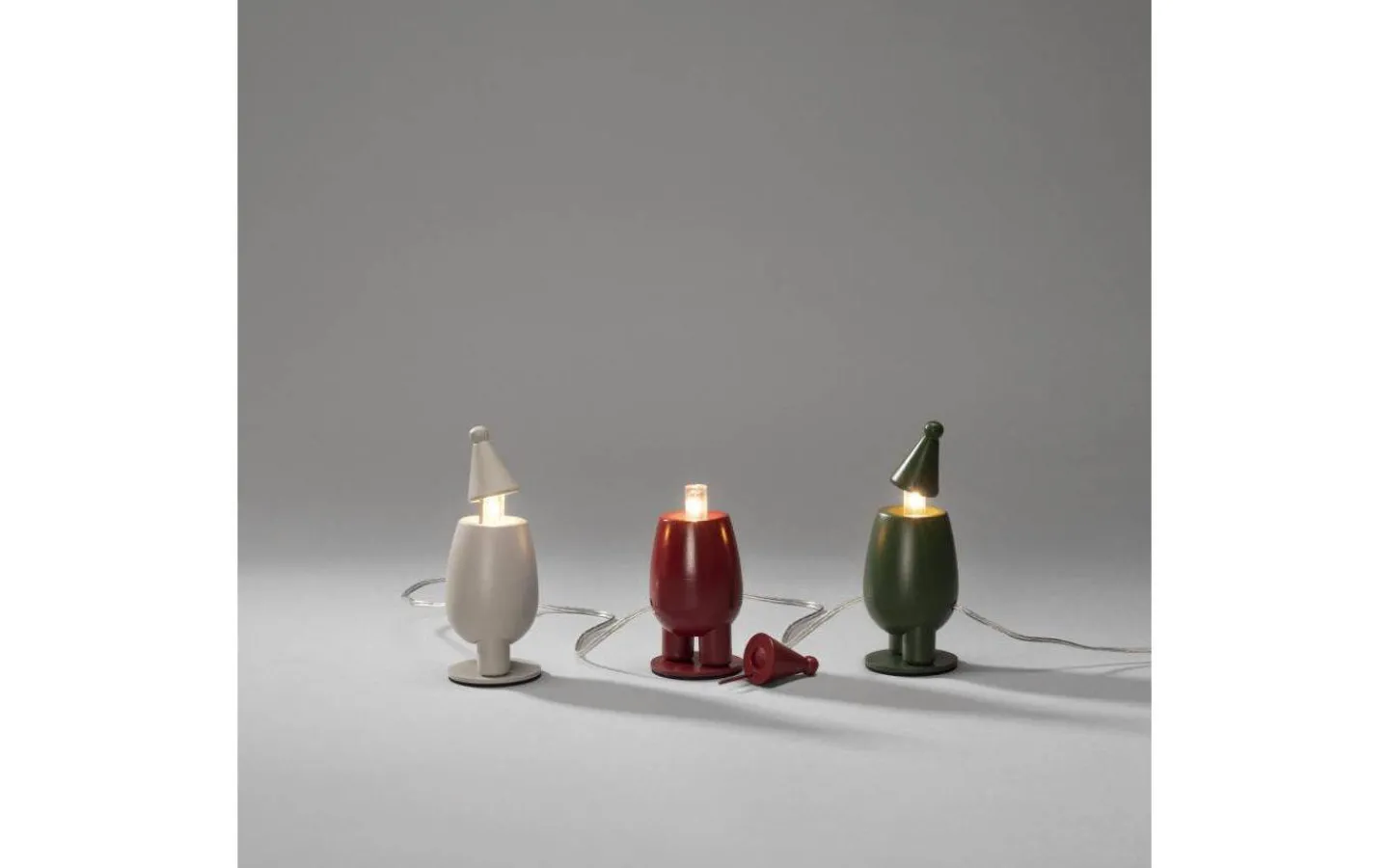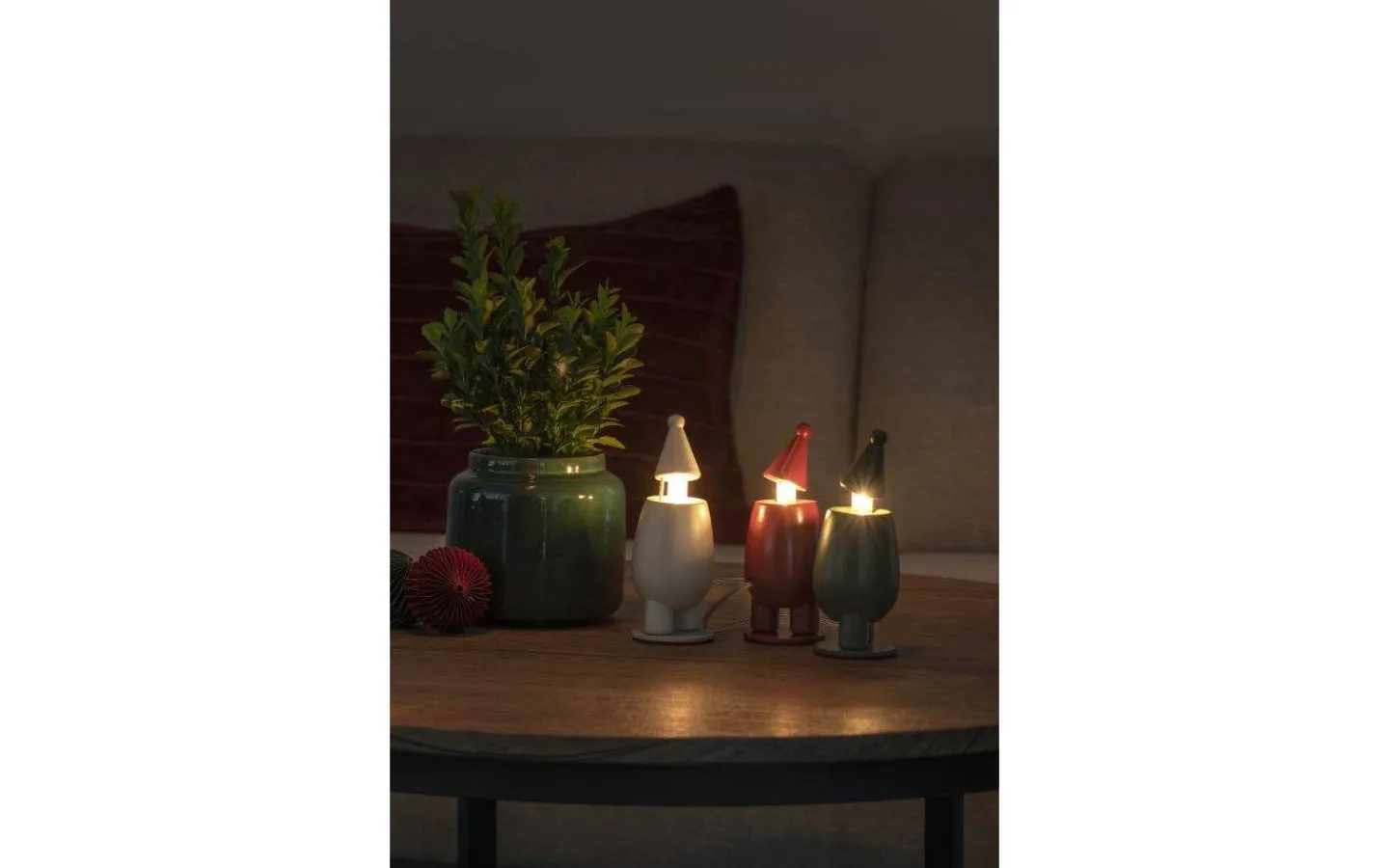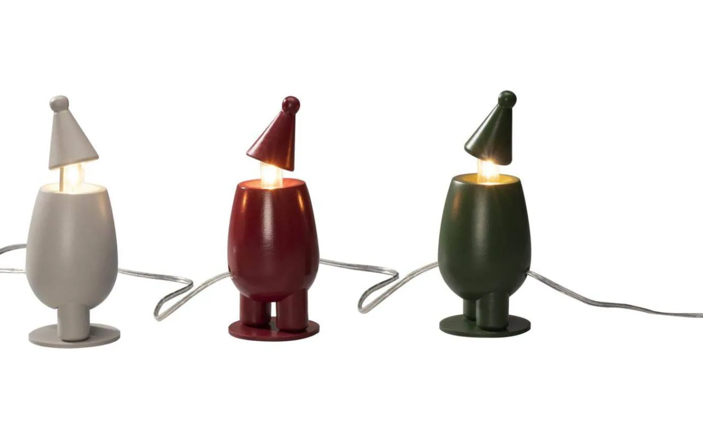 Dekorativ ljusslinga från Konstsmide med 3st färgade små tomtar. Levereras med en 2,4m lång anslutningskabel med transformator och stickkontakt för vägguttag.