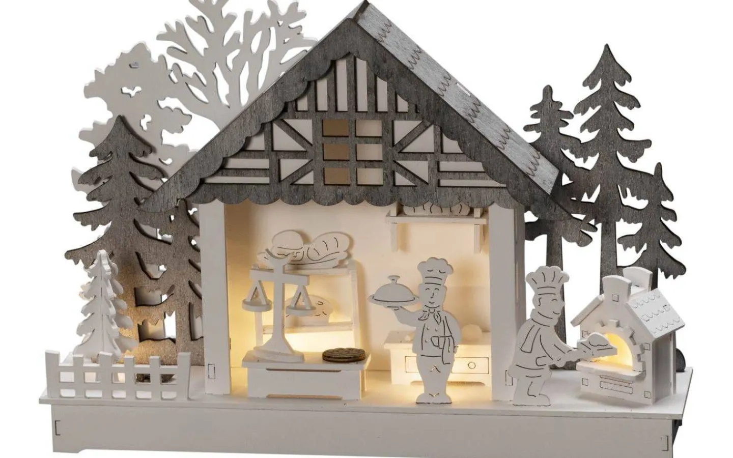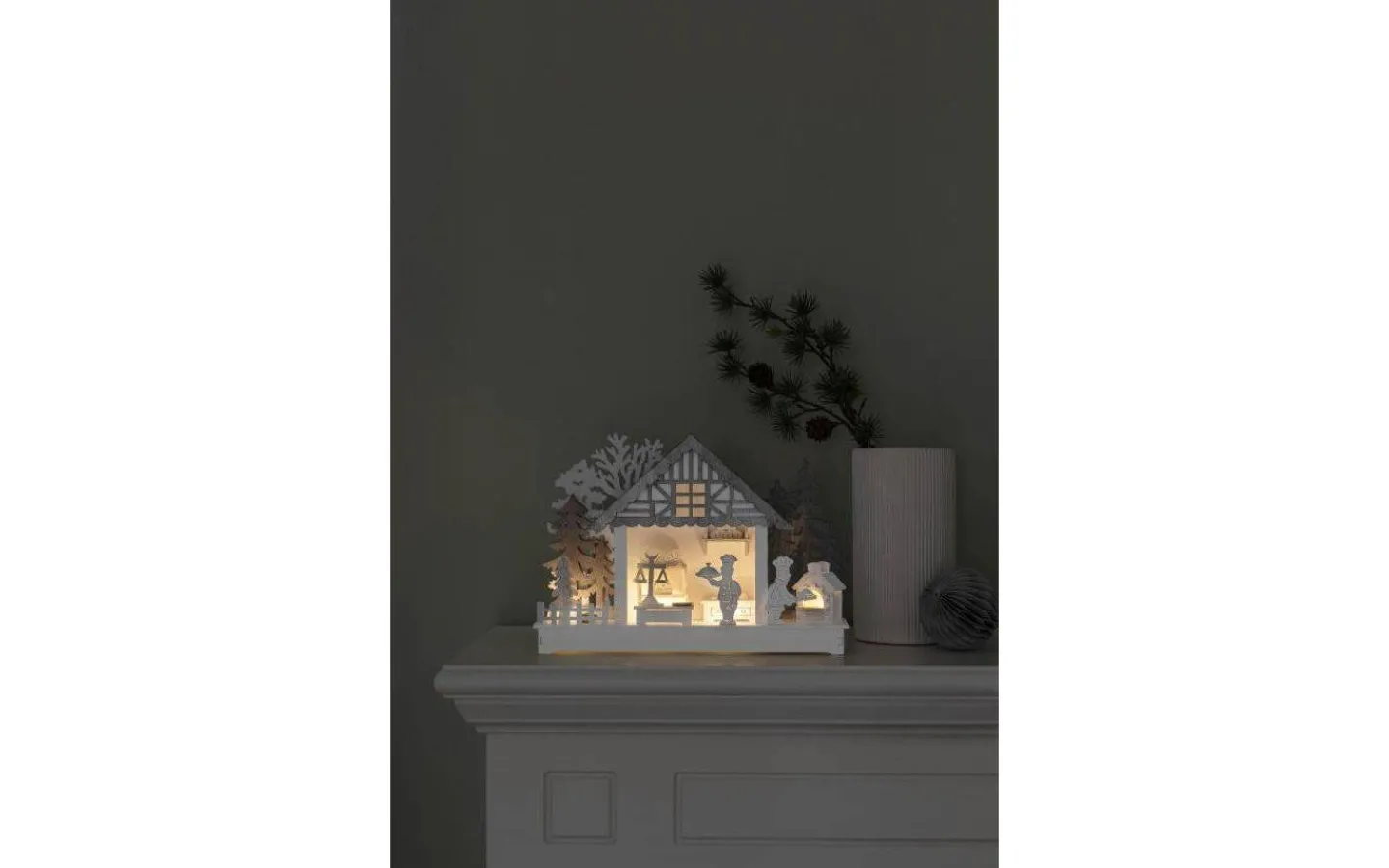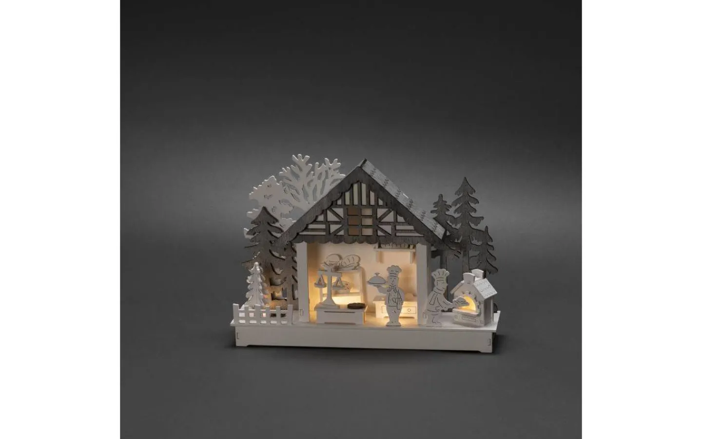 Vacker juldekoration från Konstsmide tillverkad i trä. Vacker siluett av ett hus med träd runt omkring. Inuti huset lyser en restaurang upp i ett härligt varmvitt ljussken.