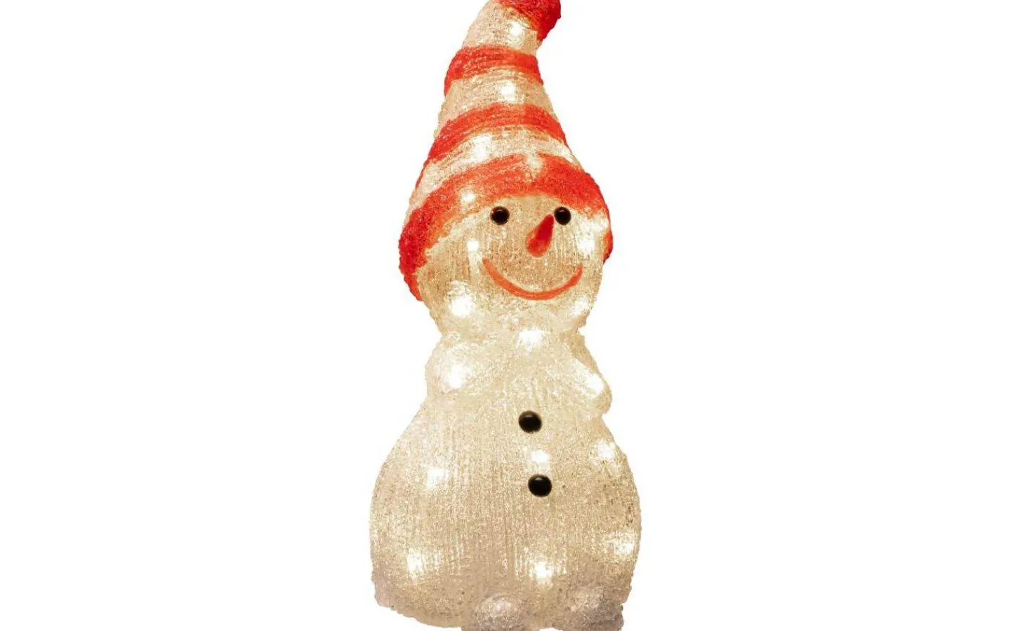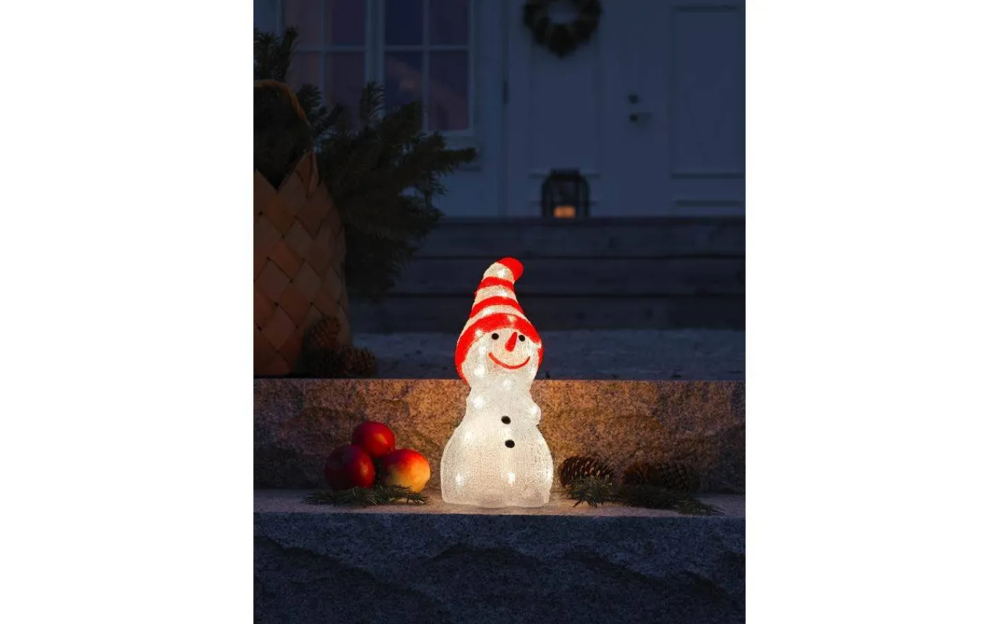 Söt liten snögubbe i akryl från Konstsmide för utomhusbruk. Snögubben har 32st små LED-lampor som lyser i ett härligt varmvitt ljussken.