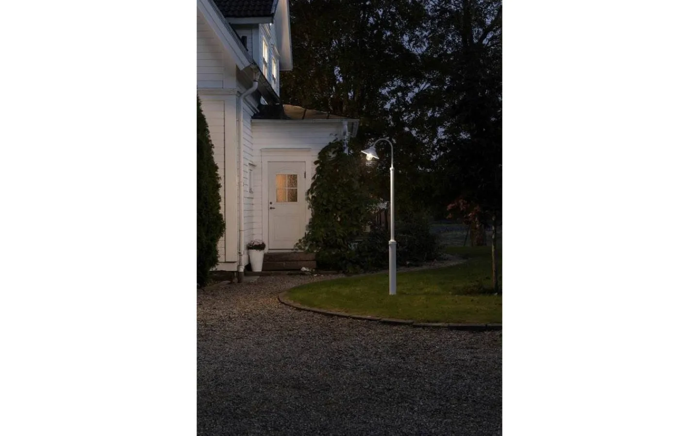 Stolplyktan är 2,4 meter hög, gjord av vit aluminium och har en fin lykta med klart glas.