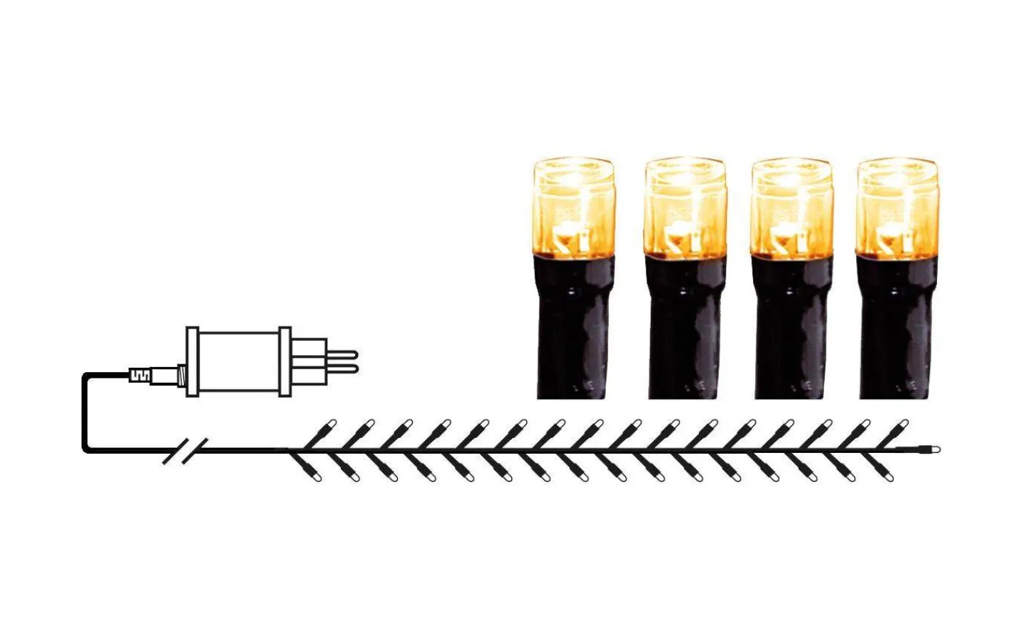 Ljusslinga med 180 LED-lampor med vackert gyllene ljussken. Slingan är 3,6 meter lång med ett avstånd på 2 cm mellan lamporna plus en anslutningskabel på 5 meter, komplett med transformator.