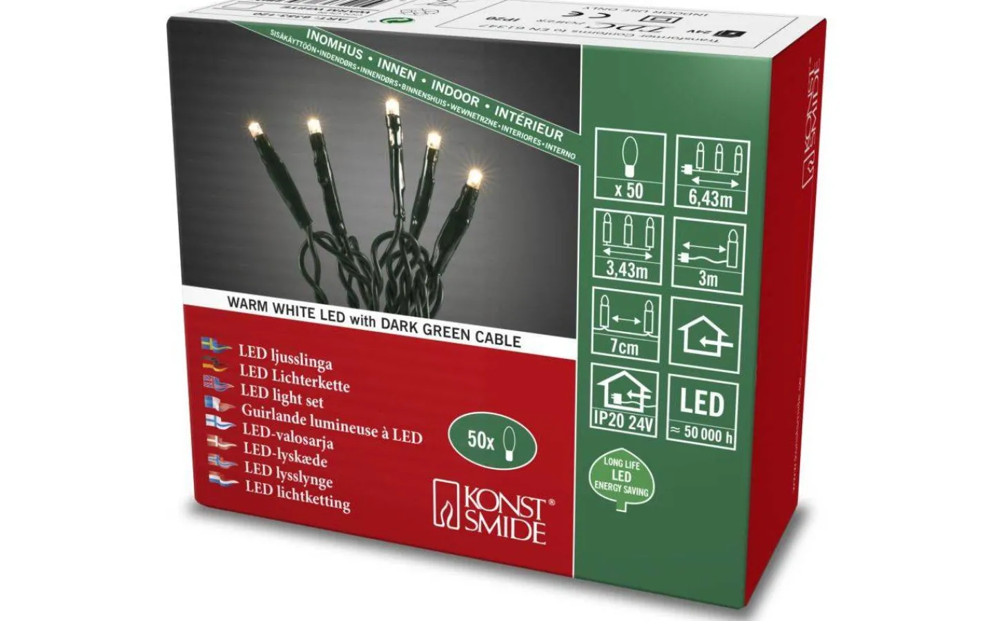 Härlig ljusslinga från Konstsmide med 50st små LED-lampor som lyser upp i ett härligt varmvitt ljussken. Slingan är 3,4m lång och är perfekt att dekorera med inomhus för att skapa en härlig atmosfär!