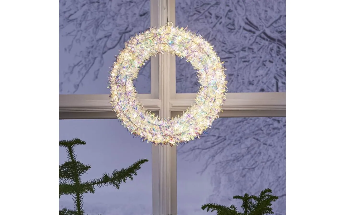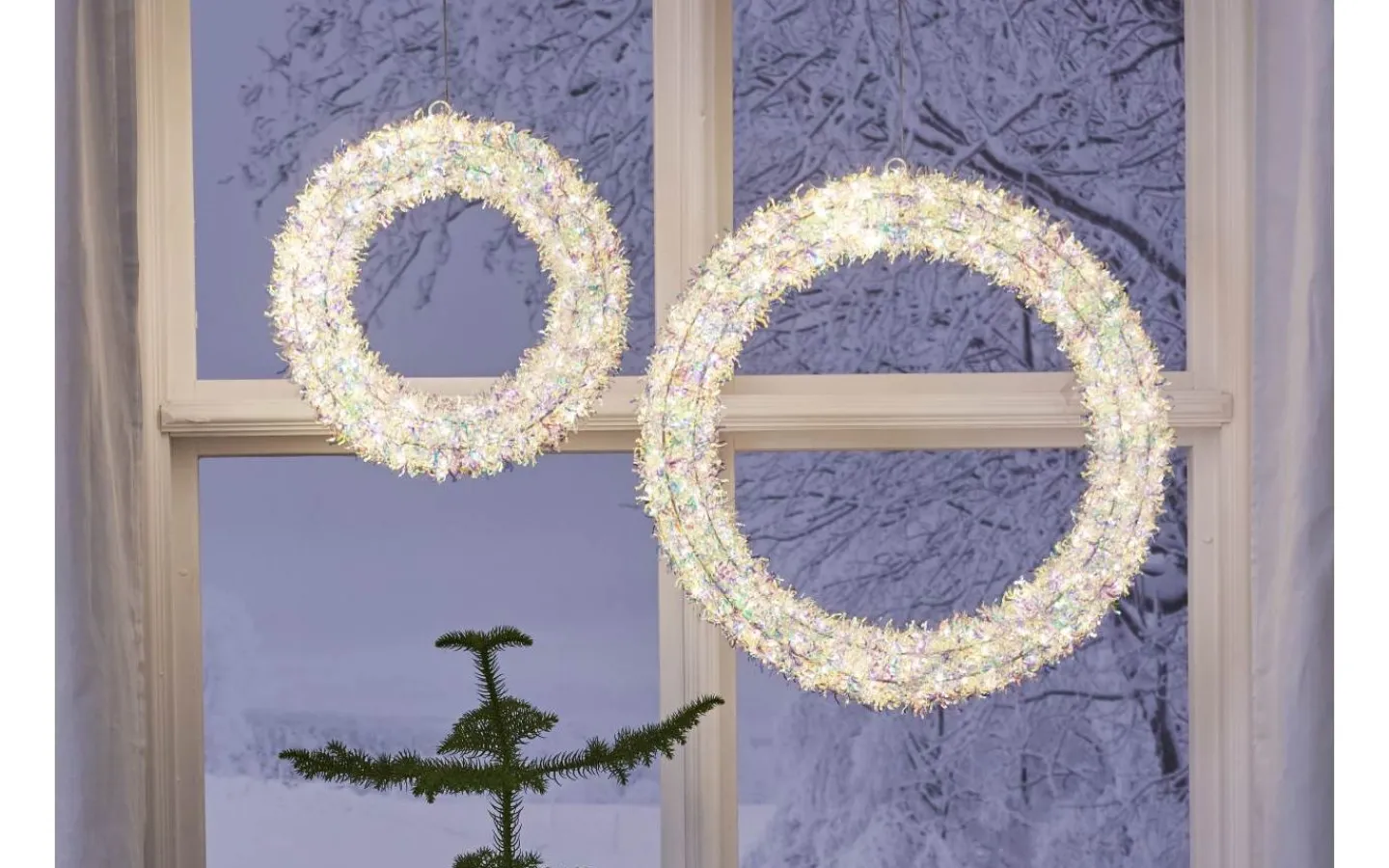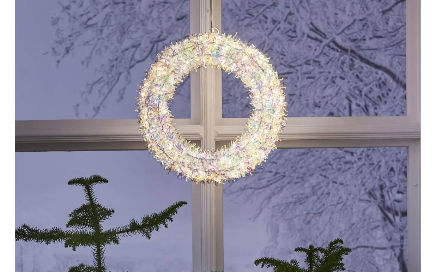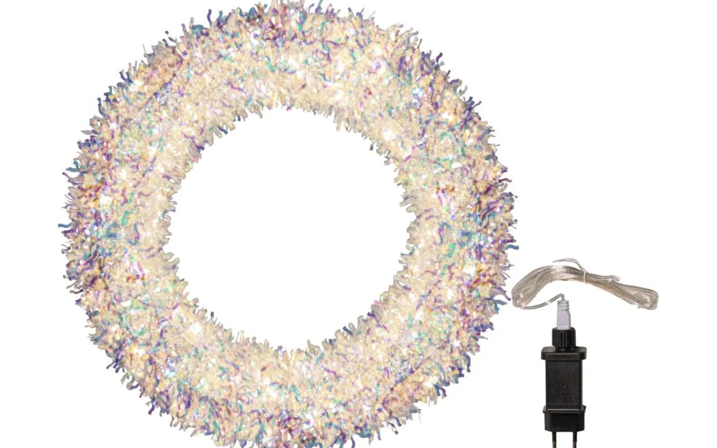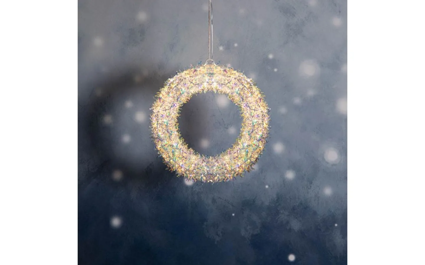 Krans, 30cm i diameter, med effektfullt skimrande PET material, sprider ett mjukt ljus vilket skapar en otroligt mysig atmosfär. IP44 klassad transformator.