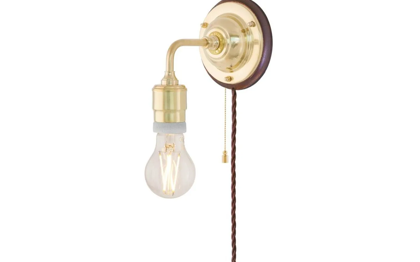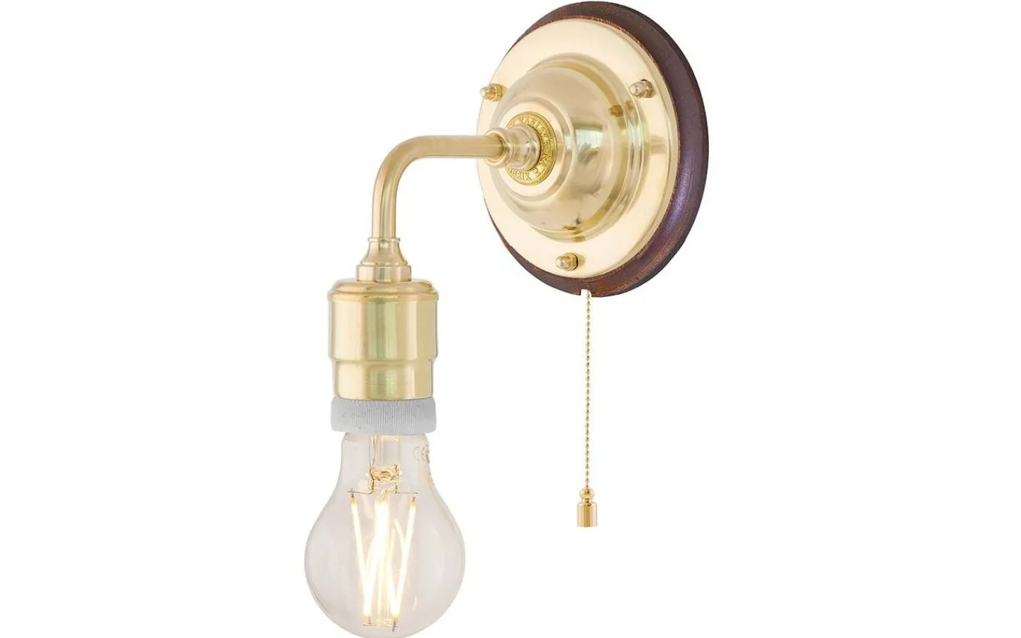 Klassisk väggarmatur tillverkad helt i mässing. Lampan saknar skärmfattning och är med sin oskärmade ljuskälla framförallt avsedd för miljöer i mer industriell stil. För fast montage. Kan kompletteras med knoppledning och stickkontakt för vanligt vägguttag.
