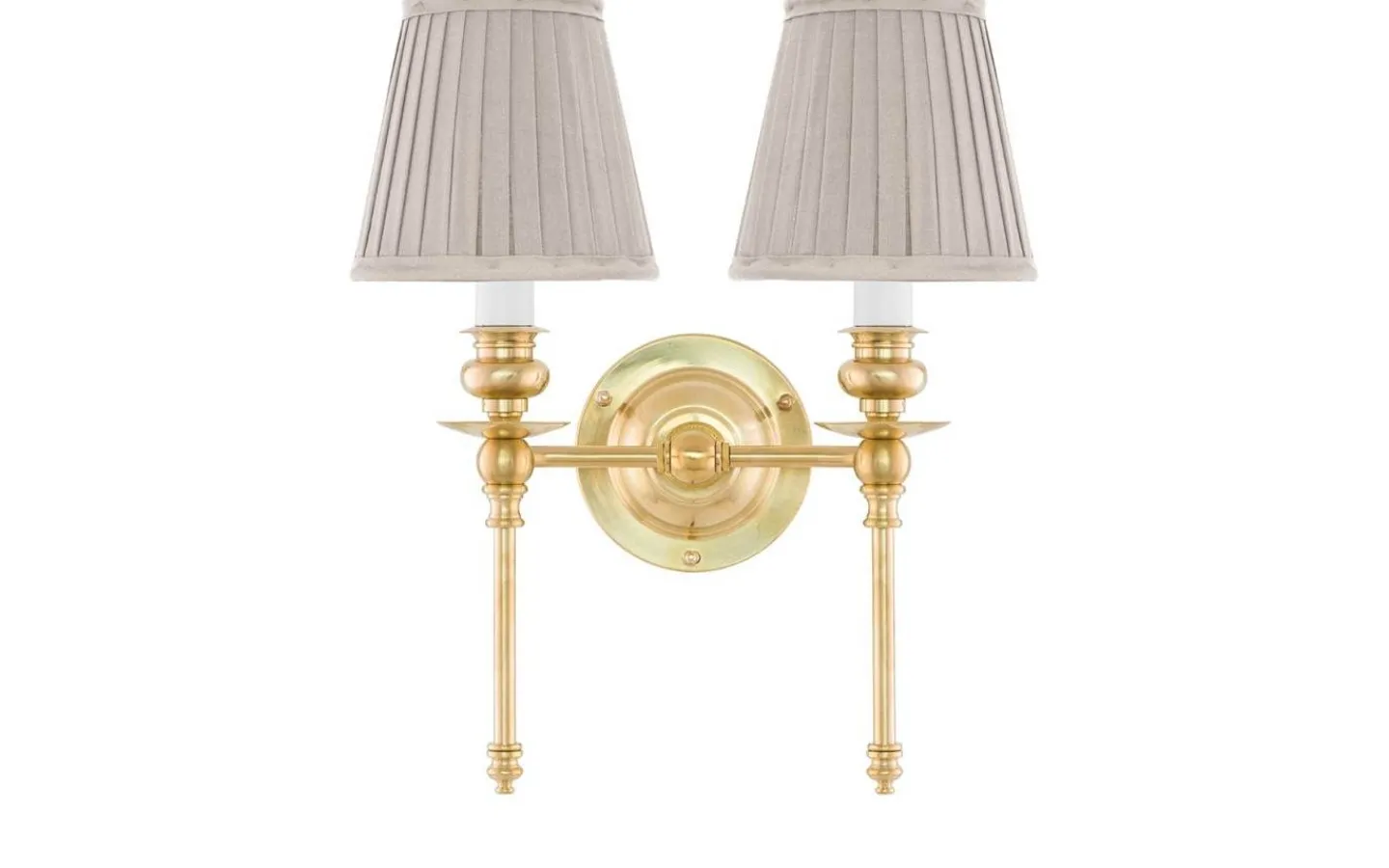 Klassisk väggarmatur för textilskärm, tillverkad helt i mässing. Främst avsedd som allmän- eller stämningsbelysning i exempelvis en korridor eller sittande på var sin sida om en spegel eller tavla. För fast montage. För att gå in med kuloledning kompletteras med en distansplatta.