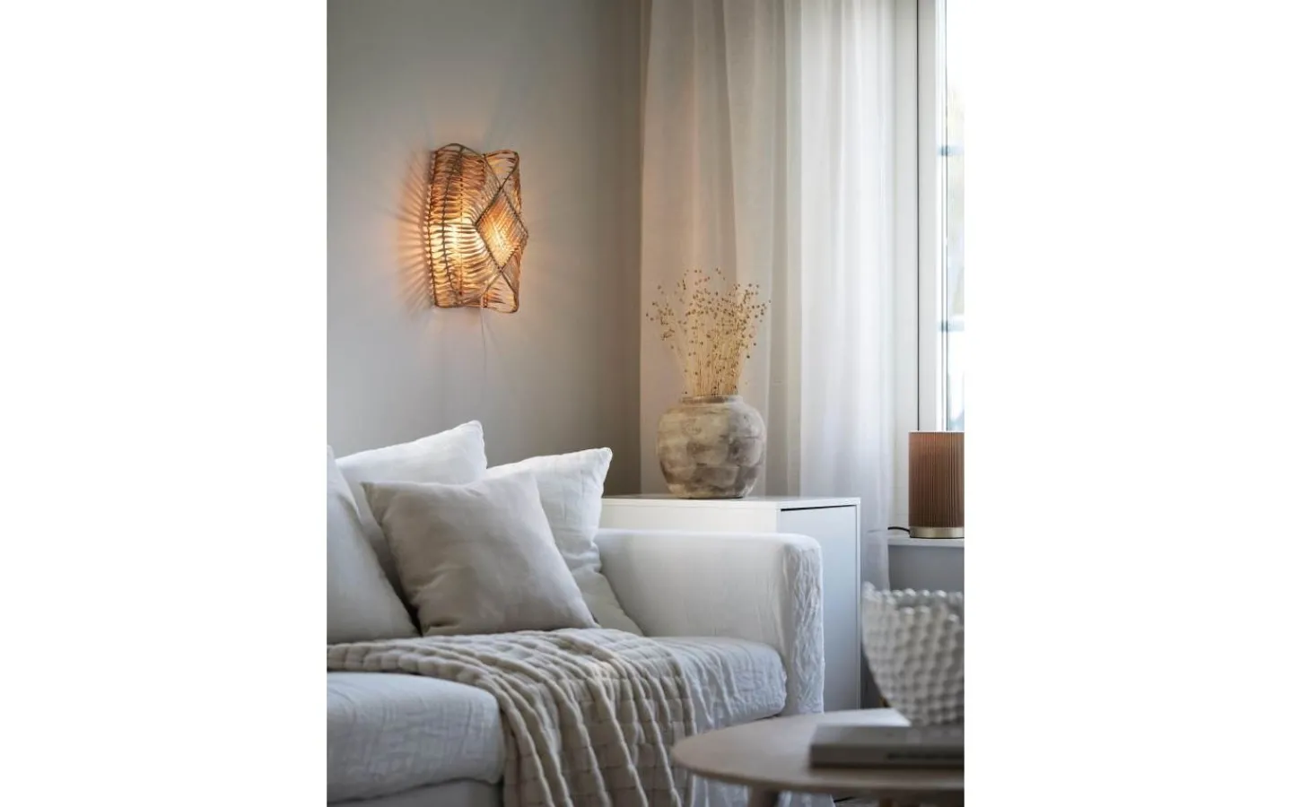 Zyla vägglampa från välkända PR Home är en vackert handgjord vägglampa i tvinnad rotting som skapar en mysig atmosfär och ett vackert sken när den är tänd.