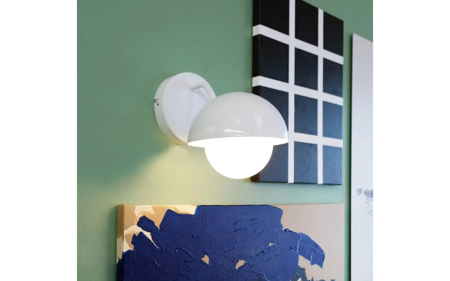 Vägglampa med glaskupol. Lampan är fast och kan inte vridas eller lutas. Lampans glaskupol sprider ljuset.