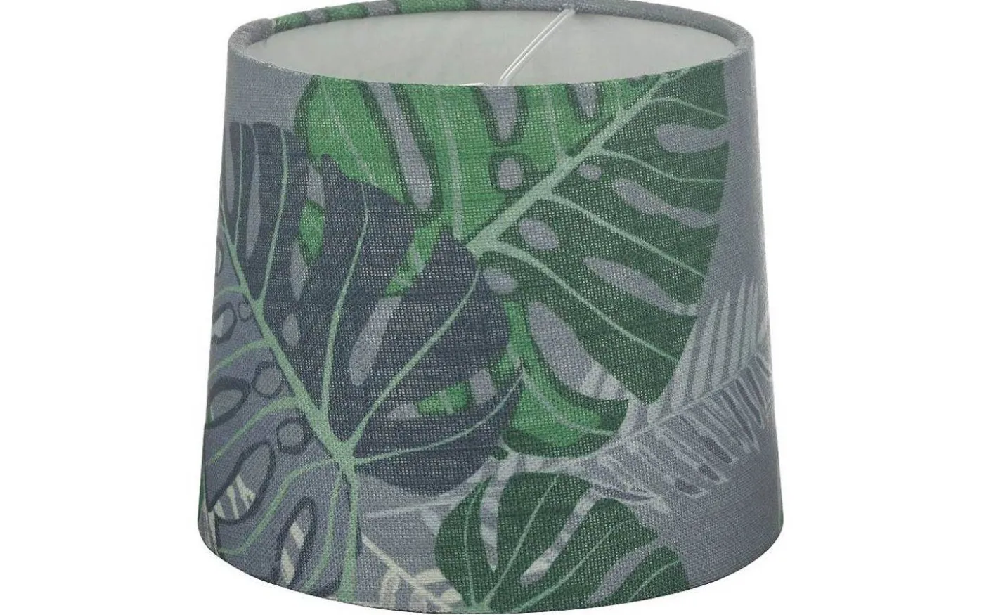 Leaf lampskärm från Oriva är en dekorativ lampskärm av tyg med vackert mönster av större löv. Lampskärmen har klofäste som fäst på en klotformad ljuskälla.