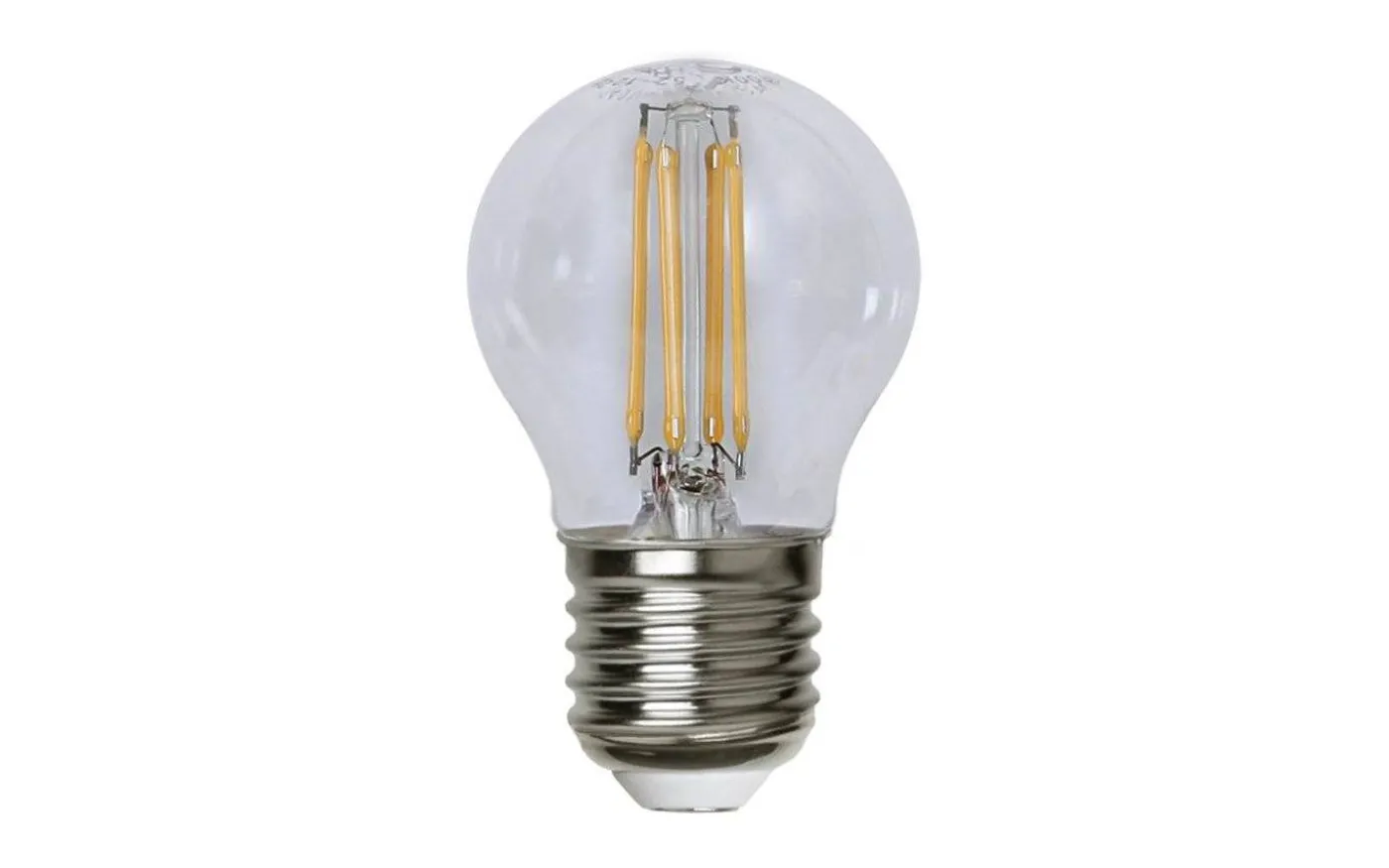 Klar filament LED-lampa med E27-sockel. Färgtemperaturen är 2700k och lampan är dimmerkompatibel. Klotformad ljuskälla med varmvitt sken. Med sina 470lm motsvarar den 40W i glödljus. En bra ersättningsmodell till de gamla 40watts glödlamporna.