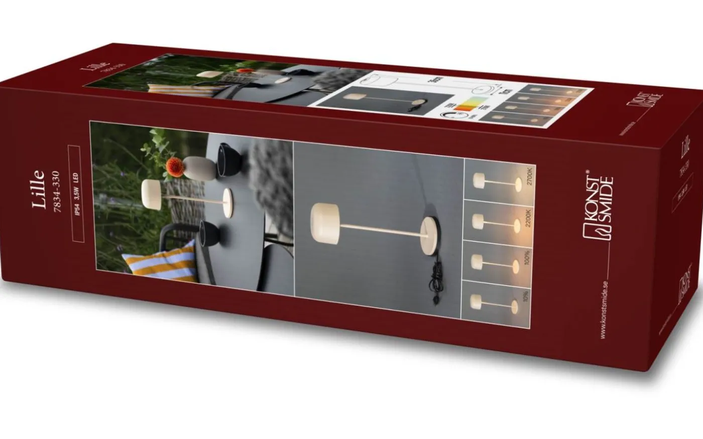 Lille uppladdningsbar bordslampa är en enkel och stilren bordslampa från välkända Konstsmide. Bordslampans inbyggda LED-ljus kan du enkelt reglera mellan 10 till 150 lumen. Du kan även reglera färgtemperaturen mellan 2200-2700K.