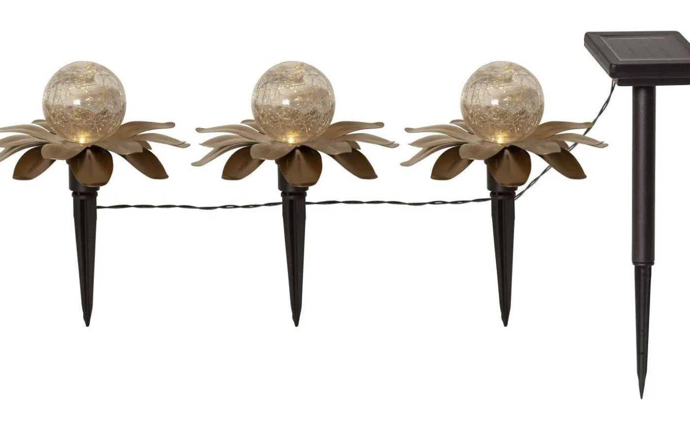 Lilly solcellslampa från Star Trading är ett vackert set om 3st dekorationer bestående av metall löv med en glaskula inuti. Dekorationerna sitter ihop med 6 cm svart kabel mellan varje dekoration och den totala längden blir ca 130cm. Denna solcellsbelysning är lättplacerad och är en vacker dekoration både på dagen och natten i din trädgård eller i en kruka på balkongen eller terrassen.