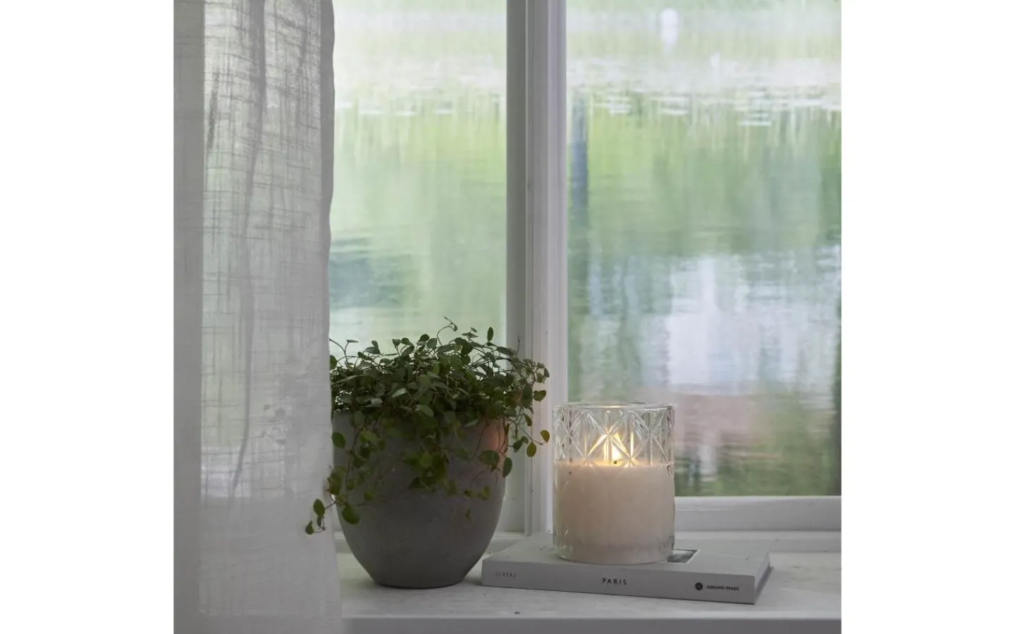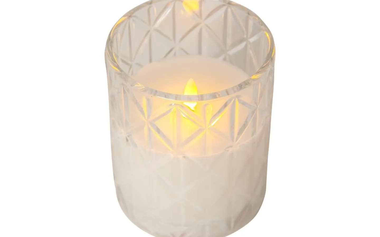 Flamme Romb från Star Trading har ett klart glashölje med rombformat mönster runt vaxljuset. Den naturtrogna runda 3D lågan är placerad på en svart veke och lyser i ett härligt varmvitt sken. Ljuslågan skiftar i ljusstyrka för att avge ett extra verklighetstroget intryck.