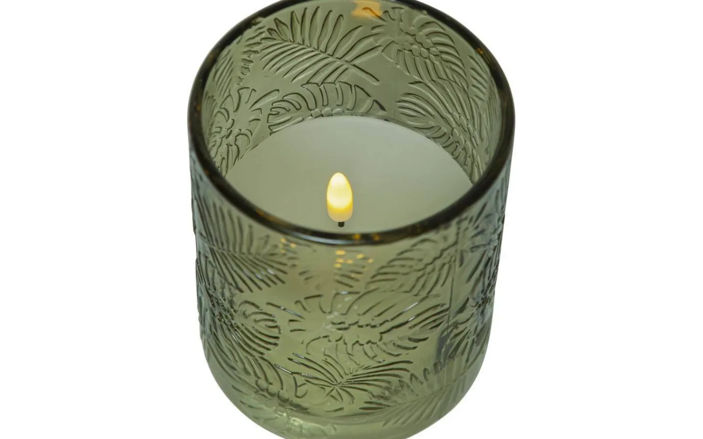 Flamme Leaf ljuslykta från Star Trading har ett grönt glas hölje med lövmönster runt vaxljuset. Detta ljus blir en vacker dekoration, både ensam som i grupp ihop med övriga ljus från vår Flamme serie.