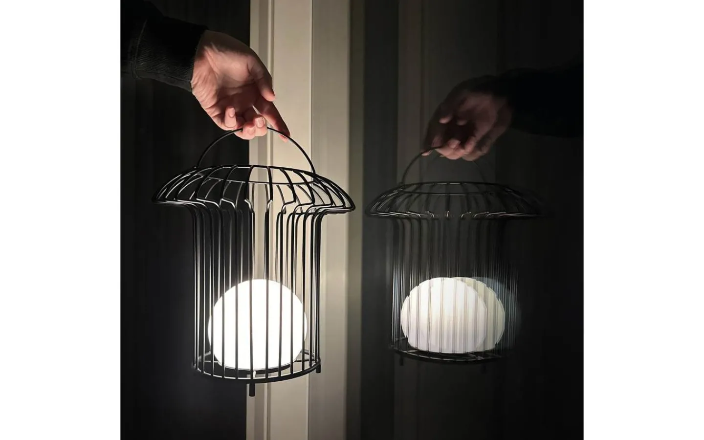 Metalllykta i form av en korg. Inbyggd solpanel, timer, 3 ljusdelar, laddning med USB-C