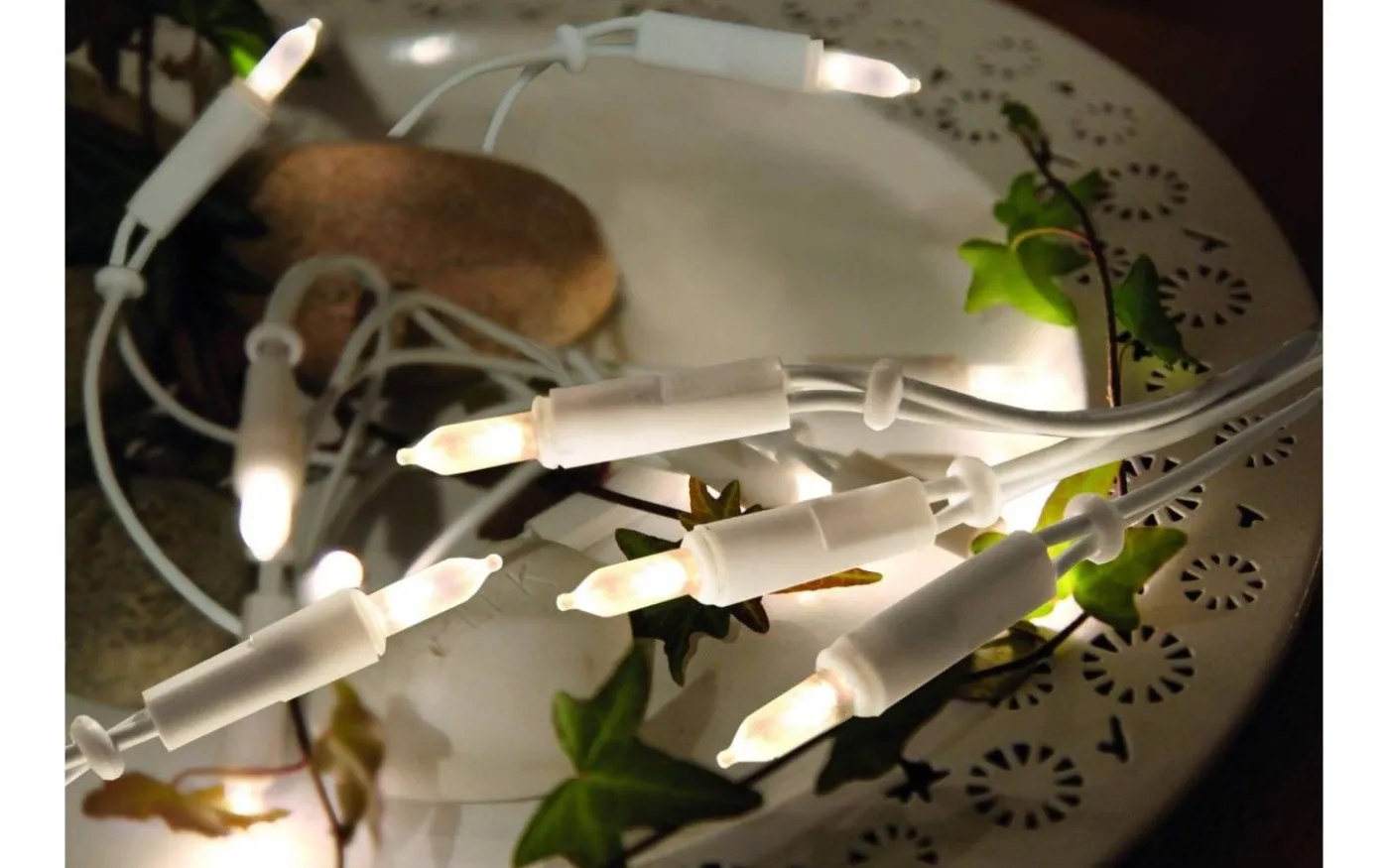 P-LED ljusslinga som är enkelledad med 20 varmvita ljuskällor för inomhusbruk. Längden är 285cm och kabeln är vit. Jättefin att dekorera med i hemmet på bord, trappor och i granen.