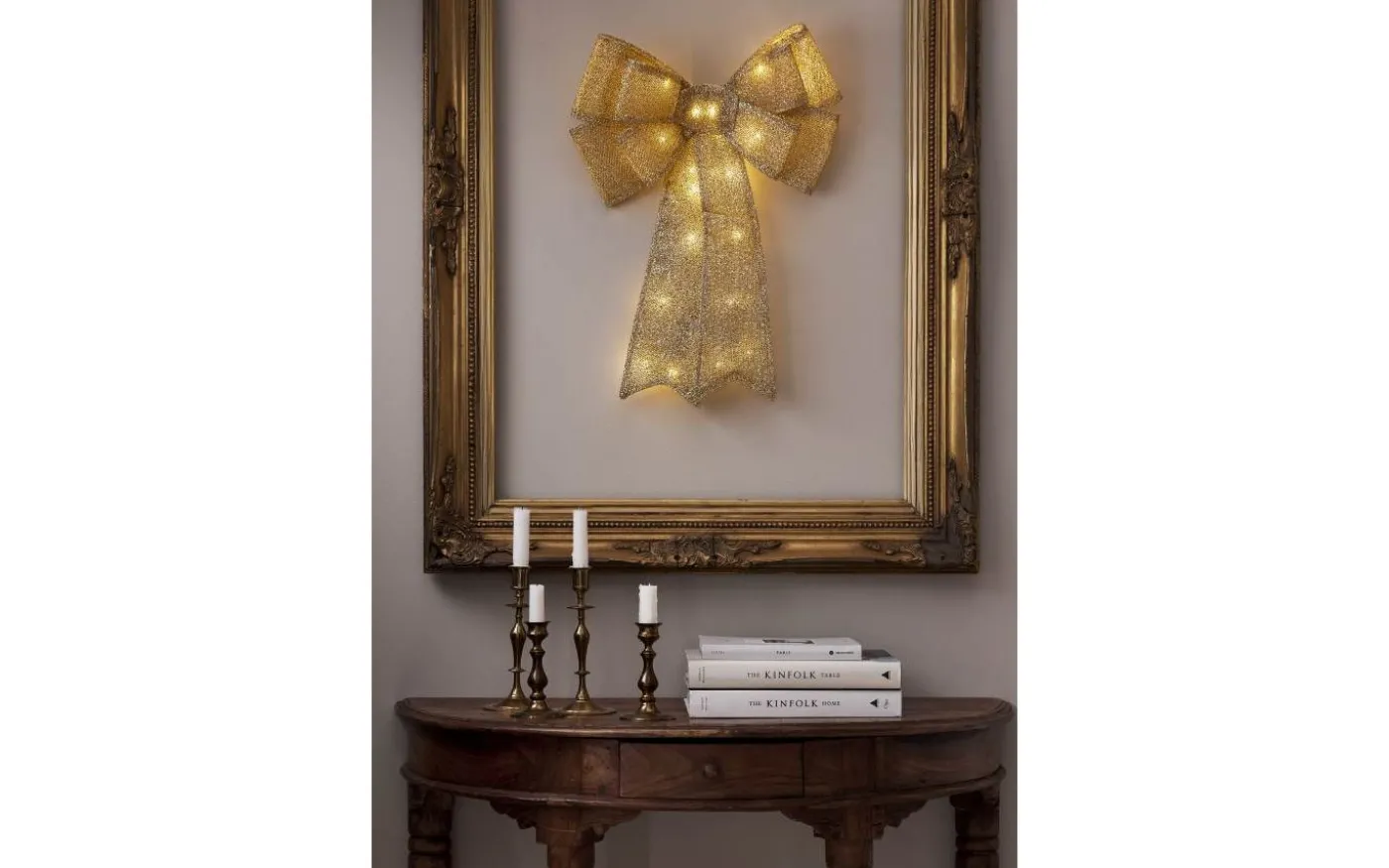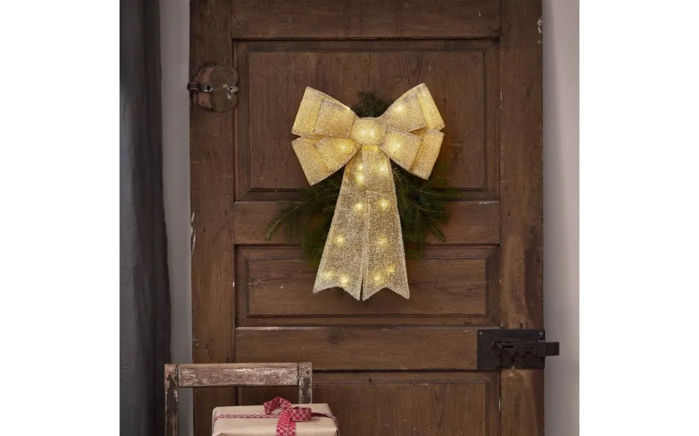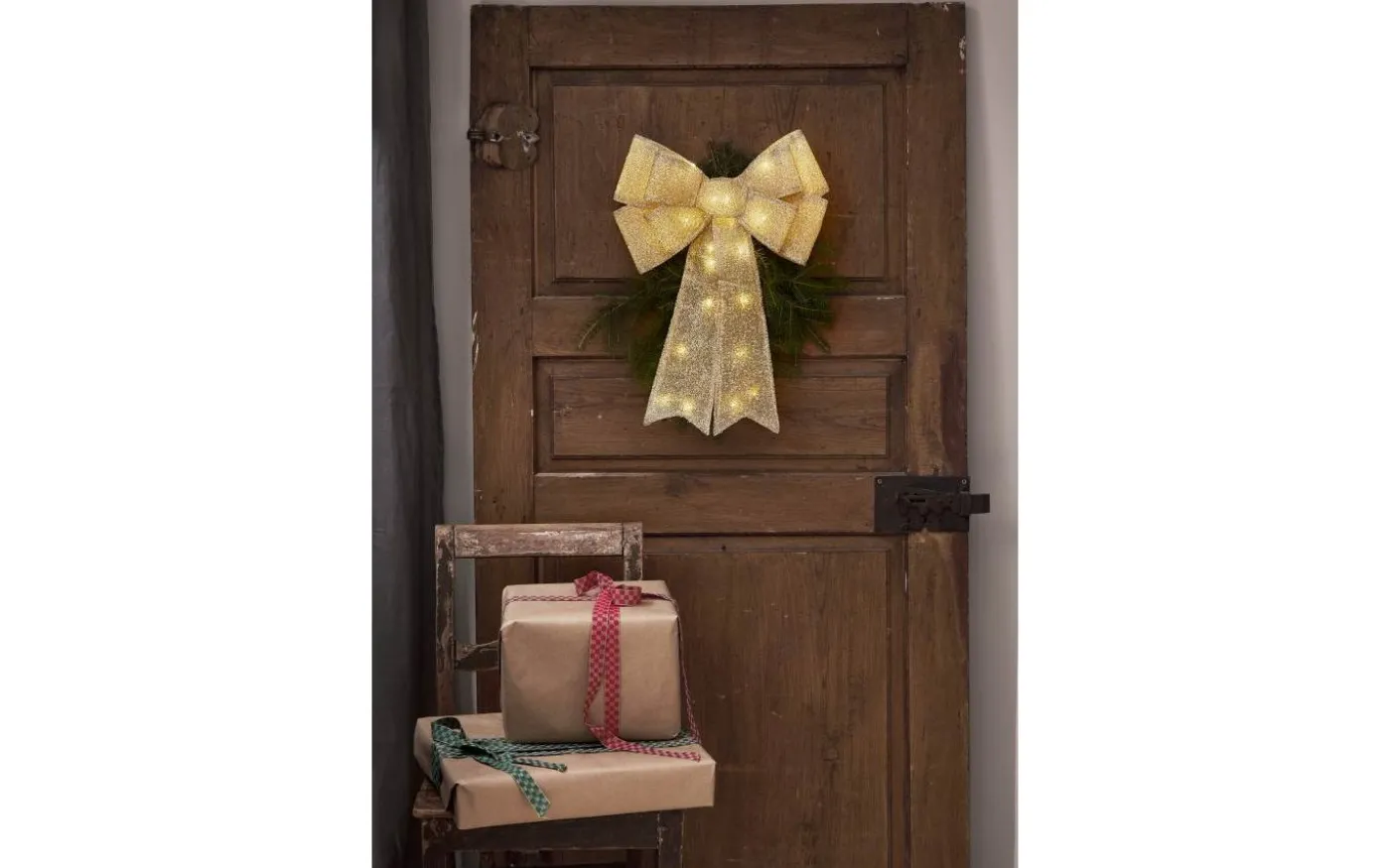 Stor guldrosett för inomhusbruk. En slinga med små LED punkter lyser fint när produkten är påslagen. Batteridriven och kan användas med timer. En dekoration som kan användas på många ställen i hemmet. Häng den i julgranen, på en dörr eller vägg och skapa julkänsla. 2 batterier AA ingår ej.