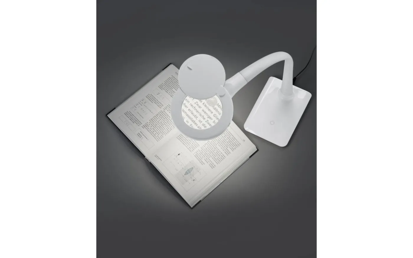 Läsa, pyssla eller reparera smådelar – bordslampan LUPO ger den förstoring och belysning som behövs. Fäst lampan på skrivbordet och justera den efter behov tack vare den flexibla armen. Den imponerar med 3x förstoring. Dessutom kan du enkelt justera ljusintensiteten efter dina behov med hjälp av den 4-vägs touchdimmern. Lampan har en höjd på 35 cm och en diameter på 13,5 cm. Den vita färgen matchar lampans enkla design, eftersom fokus ligger på funktionalitet. Integrera den enkelt i din befintliga interiör. Dessutom använder armaturerna modern LED-teknik, vilket står för hög ljuskvalitet. LED-ljuskällor kännetecknas av lång livslängd och låg värmeutveckling. Ljuskälla: inklusive 1x SMD LED, 5W · 1x 550lm, 3500K. Extra information: 4-nivå pekfunktion, flexibel, IP20, 3x förstoring