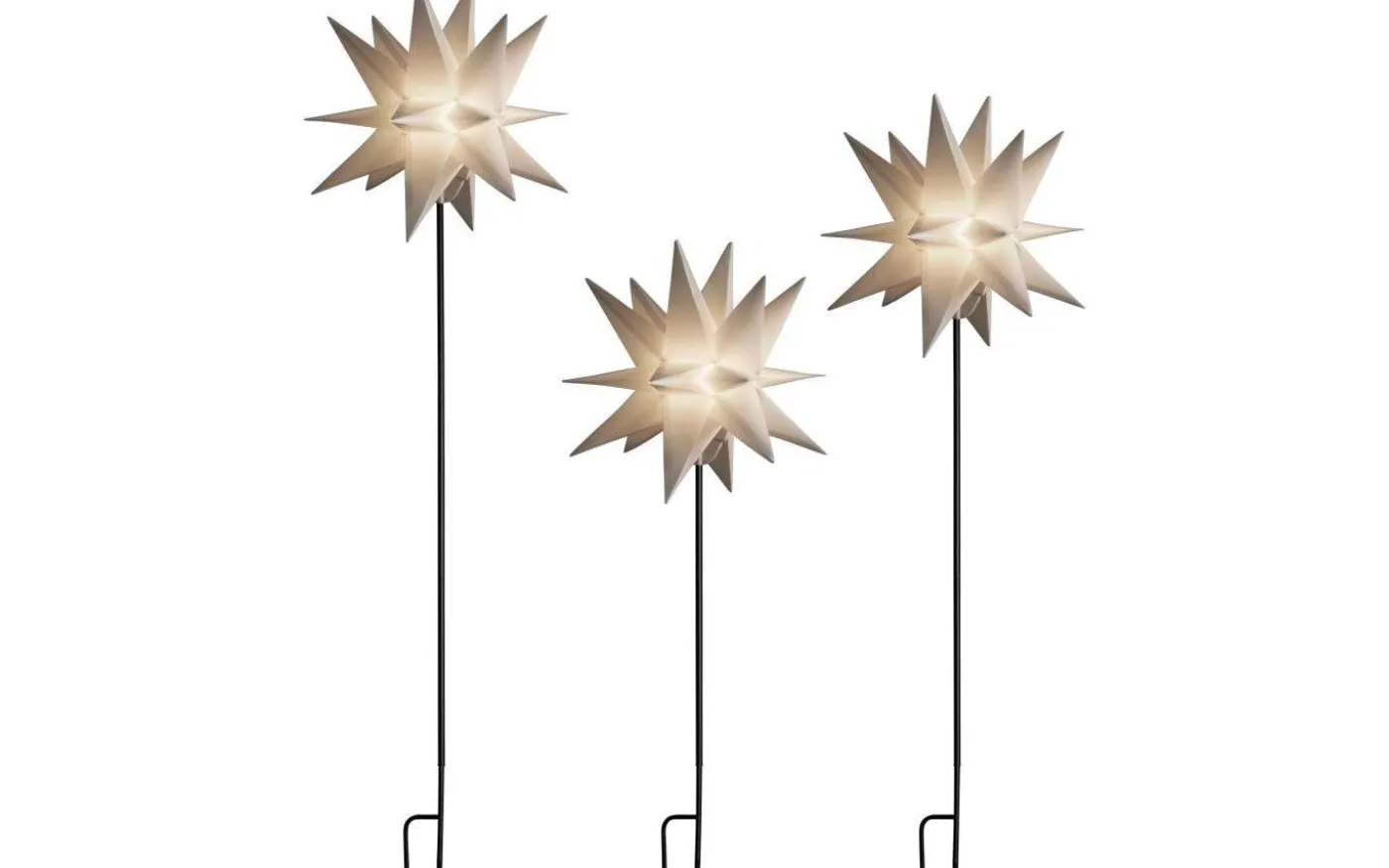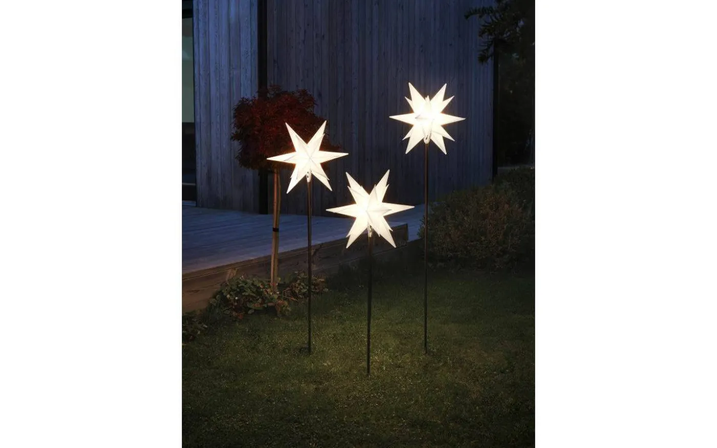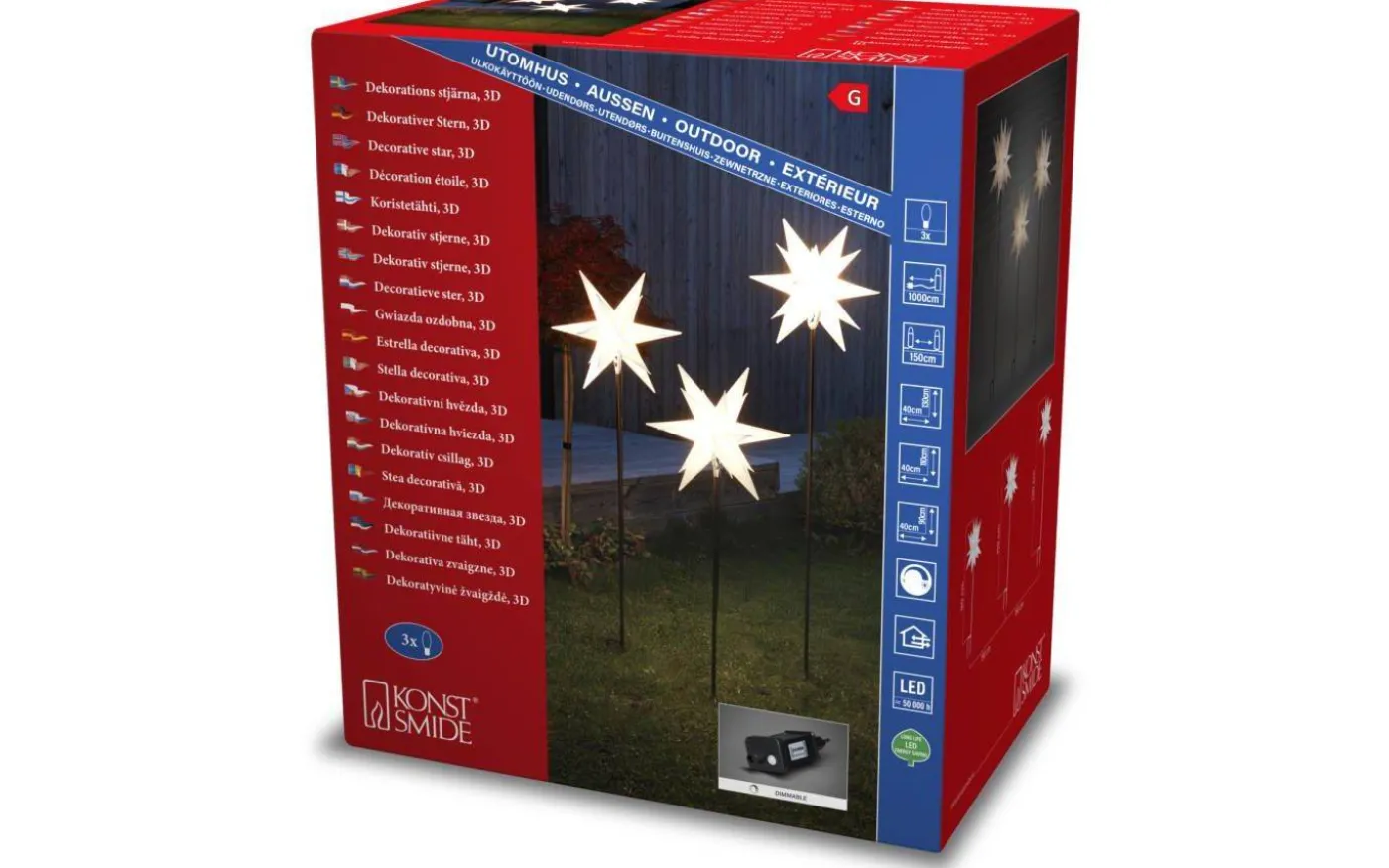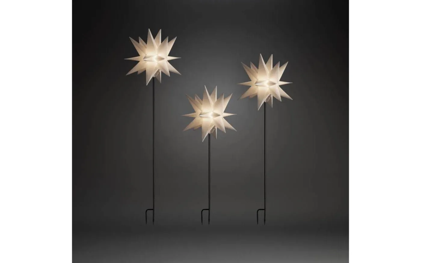 lynx från Konstsmide är en härlig utomhusdekoration. Denna dekoration består av 3st 3D stjärnor på spett i svart metall. Till varje stjärna medföljer en G4 ljuskälla i LED som lyser upp i ett härligt varmvitt ljussken.
