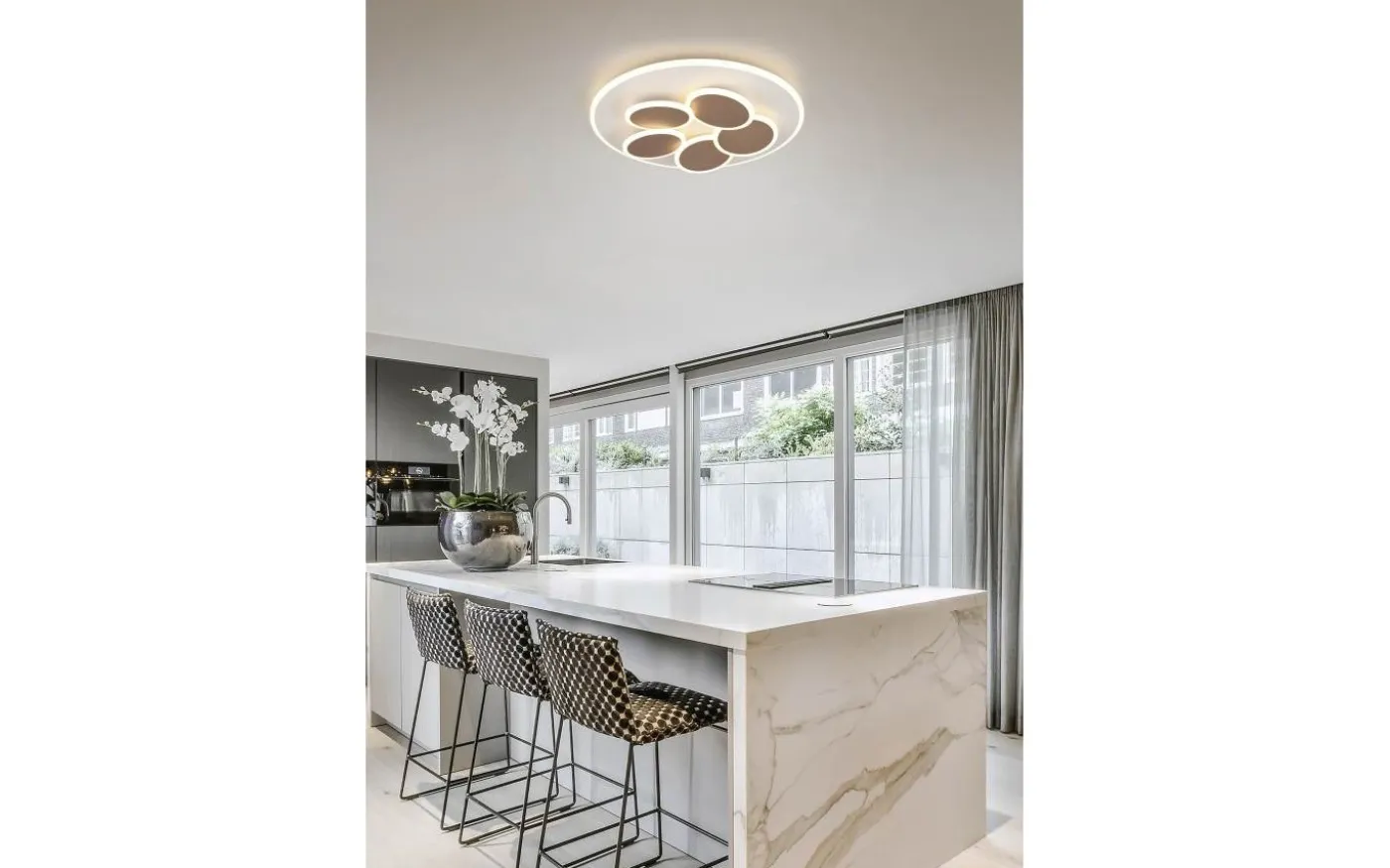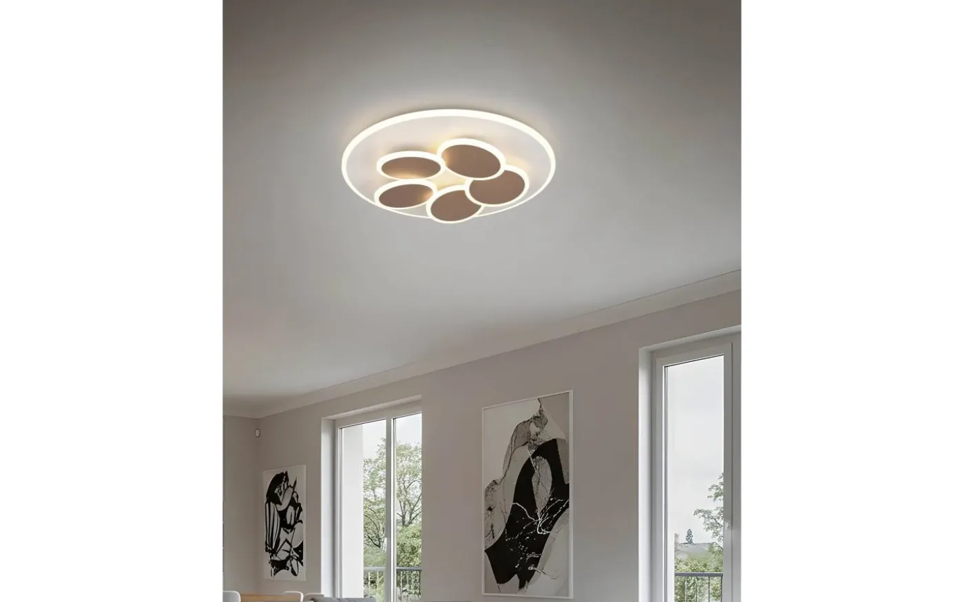 Taklampan MANDALA är ett sant konstverk! De fem små upplysta cirkulära områdena och den yttre upplysta ringen ger detta konstverk ett behagligt djup och en imponerande wow-effekt. Du kan justera ljusstyrka och ljusfärg efter behov med en fjärrkontroll. Alternativt är det möjligt att justera ljusstyrkan till 100 %, 50 % och 25 % med en vanlig ljusströmbrytare. Nattlampan och minnesfunktionen kompletterar ljuset perfekt. Det moderna samspelet mellan färgerna varmgrått och kaffe understryker armaturens speciella och eleganta design. Dessutom har armaturerna modern LED-teknik, vilket står för hög ljuskvalitet. LED-ljuskällor kännetecknas av lång livslängd och låg värmeutveckling. Ljuskälla: inklusive 1x SMD, 35W · 1x 4200lm, 2700 – 6500K. Extra information: Integrerad dimmer, IP20, Ljusfärg steglöst variabel, Minnesfunktion, Nattlampa, Ej lämplig för extern dimmer, Fjärrkontroll, Dimbar via strömbrytare, Timer, Vägg- och takmontering