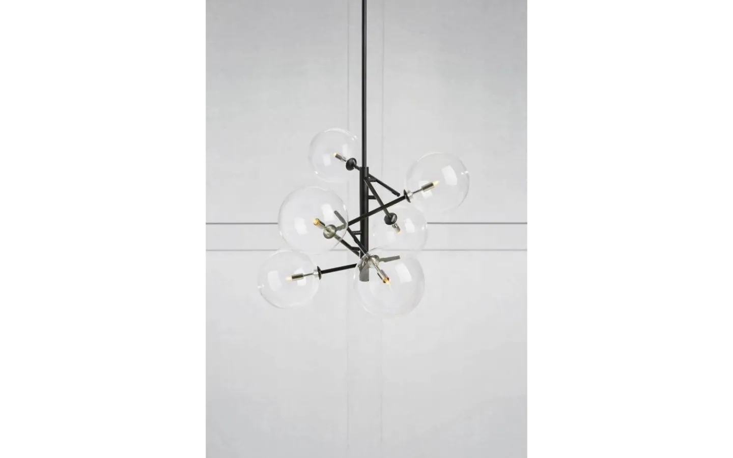 Vackra Andrew takpendel från Markslöjd, en iögonfallande taklampa i svart metall och sex glober i klart glas. Tidlös design som passar i de flesta hem. Lampan kan enkelt förkortas till önskad höjd och hänges enkelt på takkrok. Du justerar själv enkelt de ställbara armarna, samt justerar höjden på taklampan med hjälp av fyra stycken avtagbara rör på 30 cm (max 1,2 m).