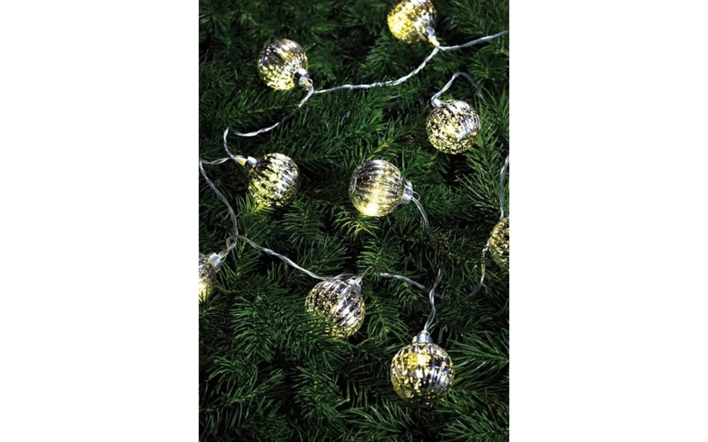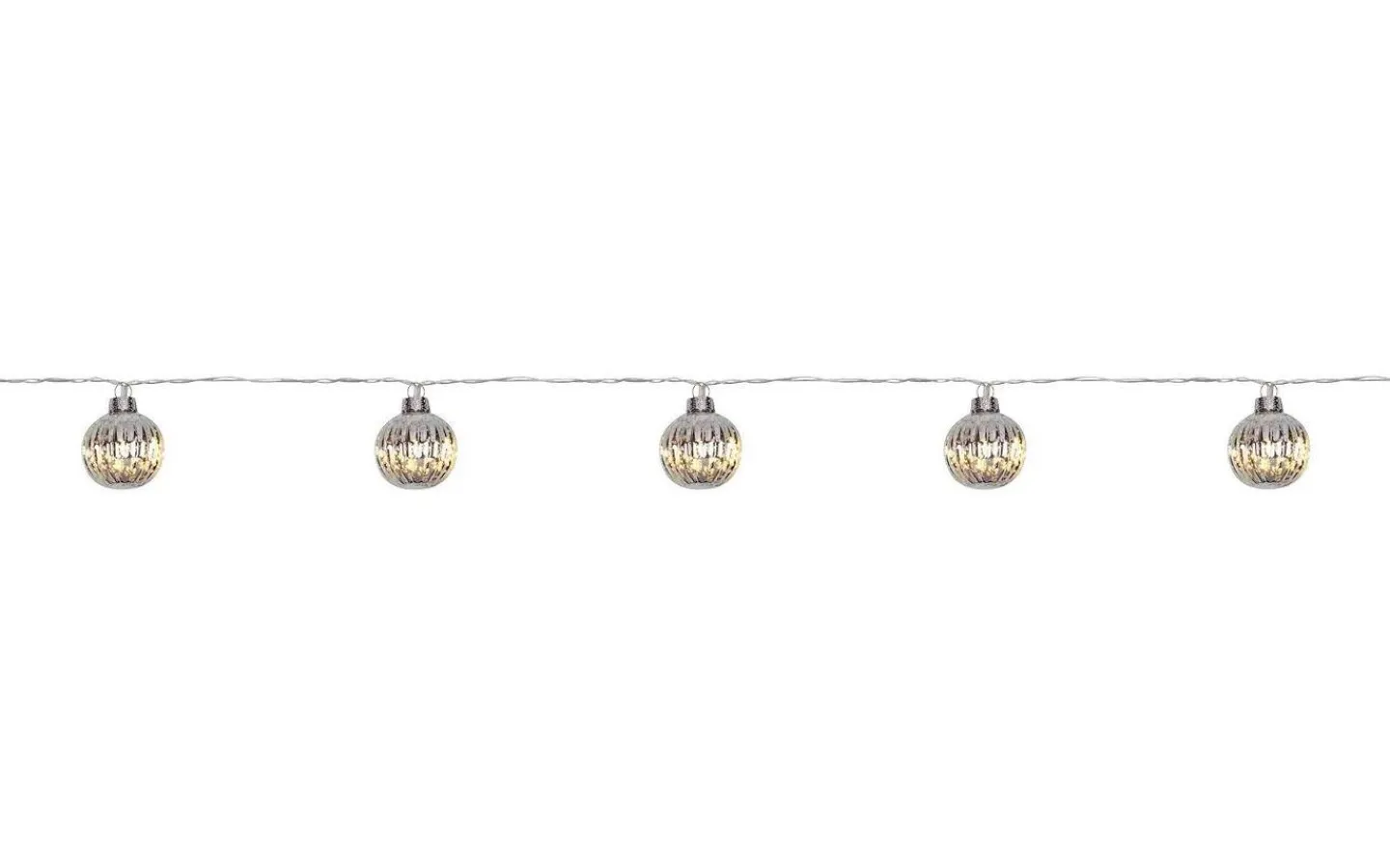 Ljusslinga med 10st fina glaskulor. Tekniskt : 1,4m lång slinga med fast LED-belysning. Drivs med 3xAA batterier, ingår ej. Har timerfunktion.