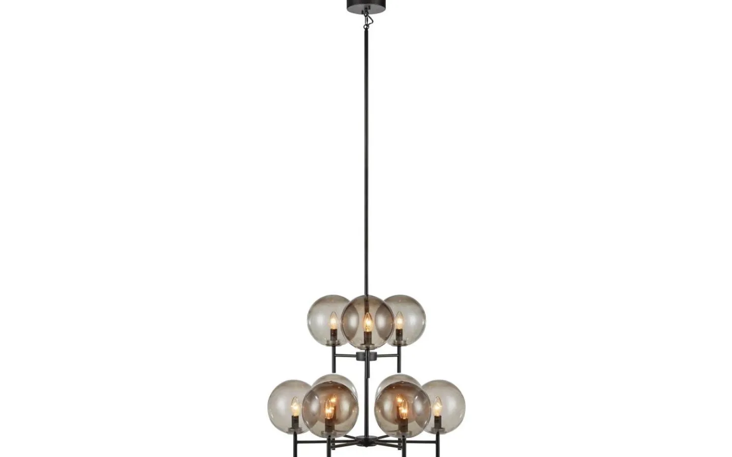 Fina Crown takkrona, från välkända Markslöjd, är en pampig taklampa i svartlackerad stomme med nio stycken glasglober i rökglas.