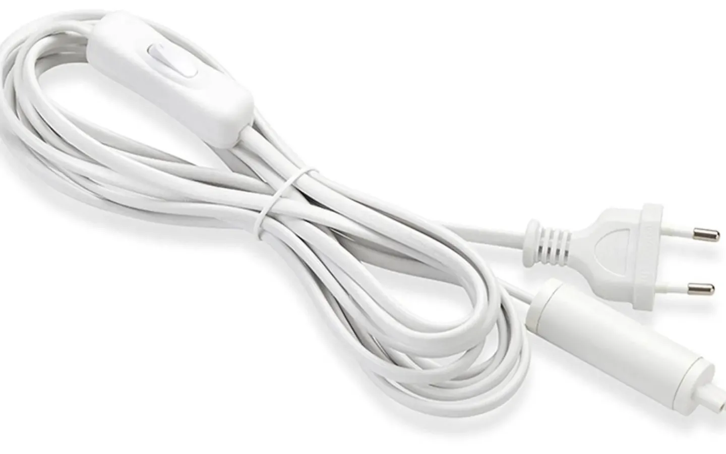 I ena änden av kabeln finns en vit snabbkoppling som du enkelt kopplar in i belysningsskenan. I den andra änden finner du en stickkontakt för vägguttag. På sladden finns en strömbrytare för enkel tändning och släckning.