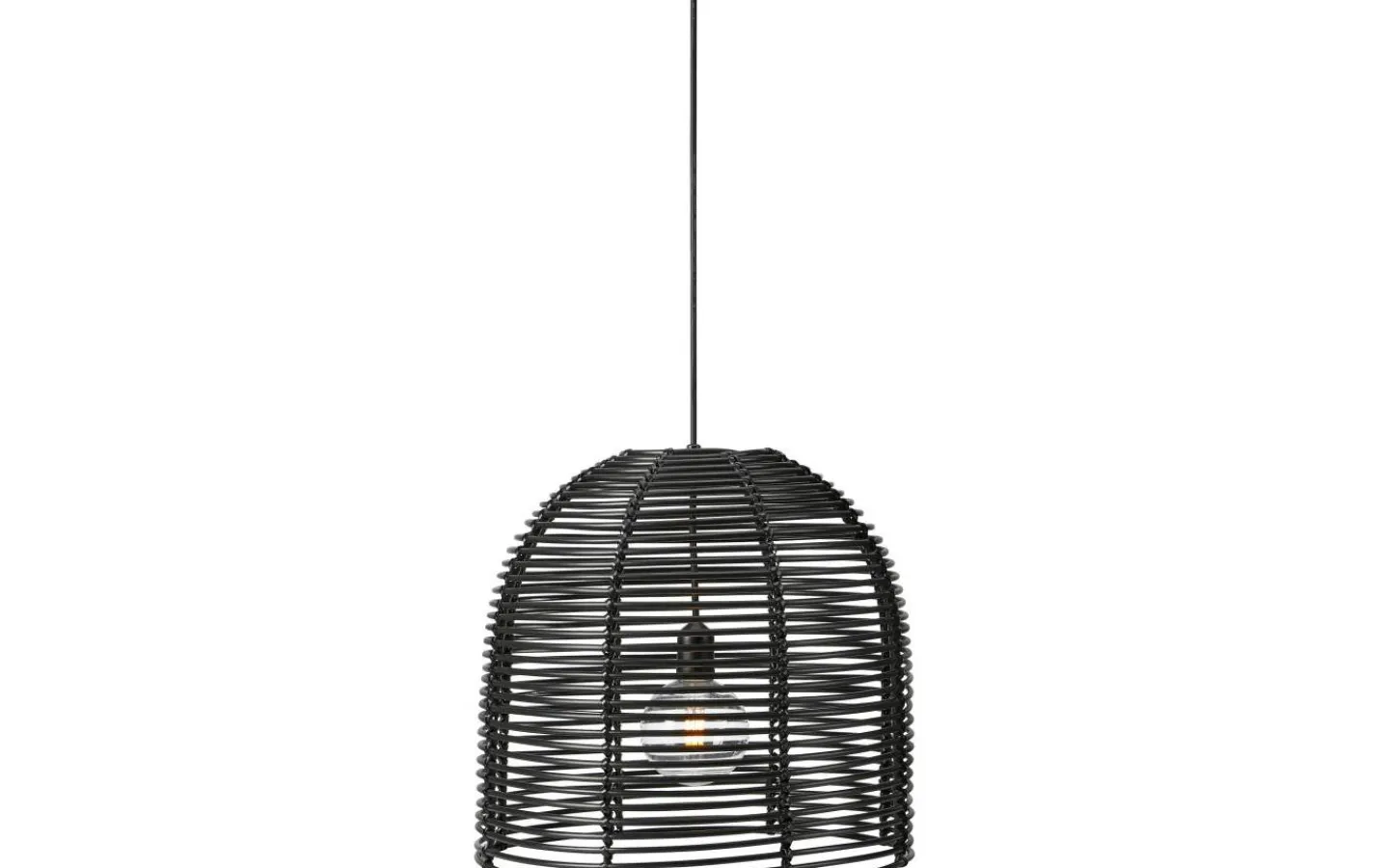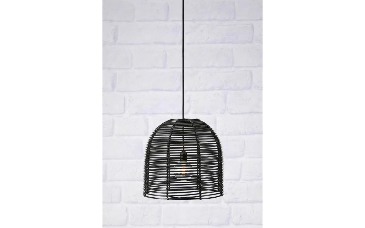 Skärmen är gjord i svart plast och avger en modern känsla av rotting som passar perfekt över matbordet eller över loungegruppen. Denna taklampa har inbyggd ljuskälla i LED av högsta kvalitet, som har låg energiförbrukning och väldigt lång livslängd. Ljuskällan avger ett dekorativt varmvitt ljussken och hjälper dig att skapa en mysig stämning på din uteplats!