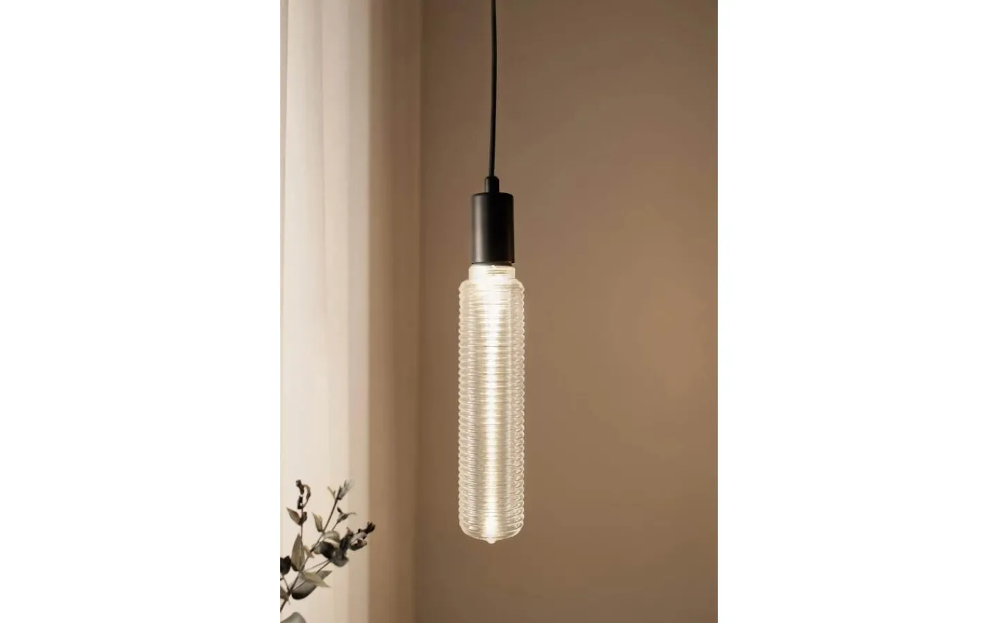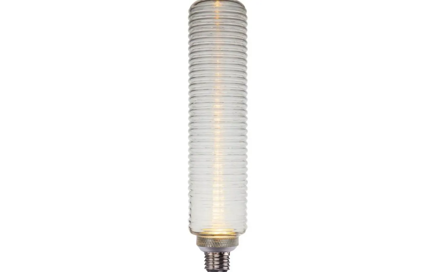 Ljuskälla i cylinderformat, linjerat klarglas med behagligt stämningsljus. Dimbar. Denna glödlampa passar bra i en enkel fönsterlampa eller taklampa utan lampskärm. Stor storlek om 6,4 cm i diameter och totalhöjd på 30,8cm inklusive sockeln. Finns även i rökfärgat glas.
