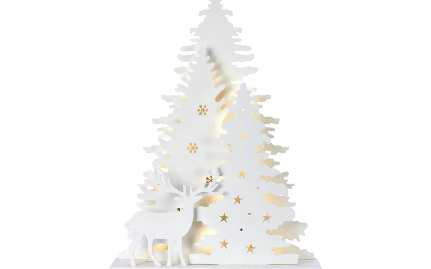 Madera bordsdekoration från Markslöjd. Vit målad MDF. 14 st LED-ljus med varm vitt sken. 2800K. On/Off brytare på batteribox. Drivs med 2xAA batterier. Batterier ingår ej.
