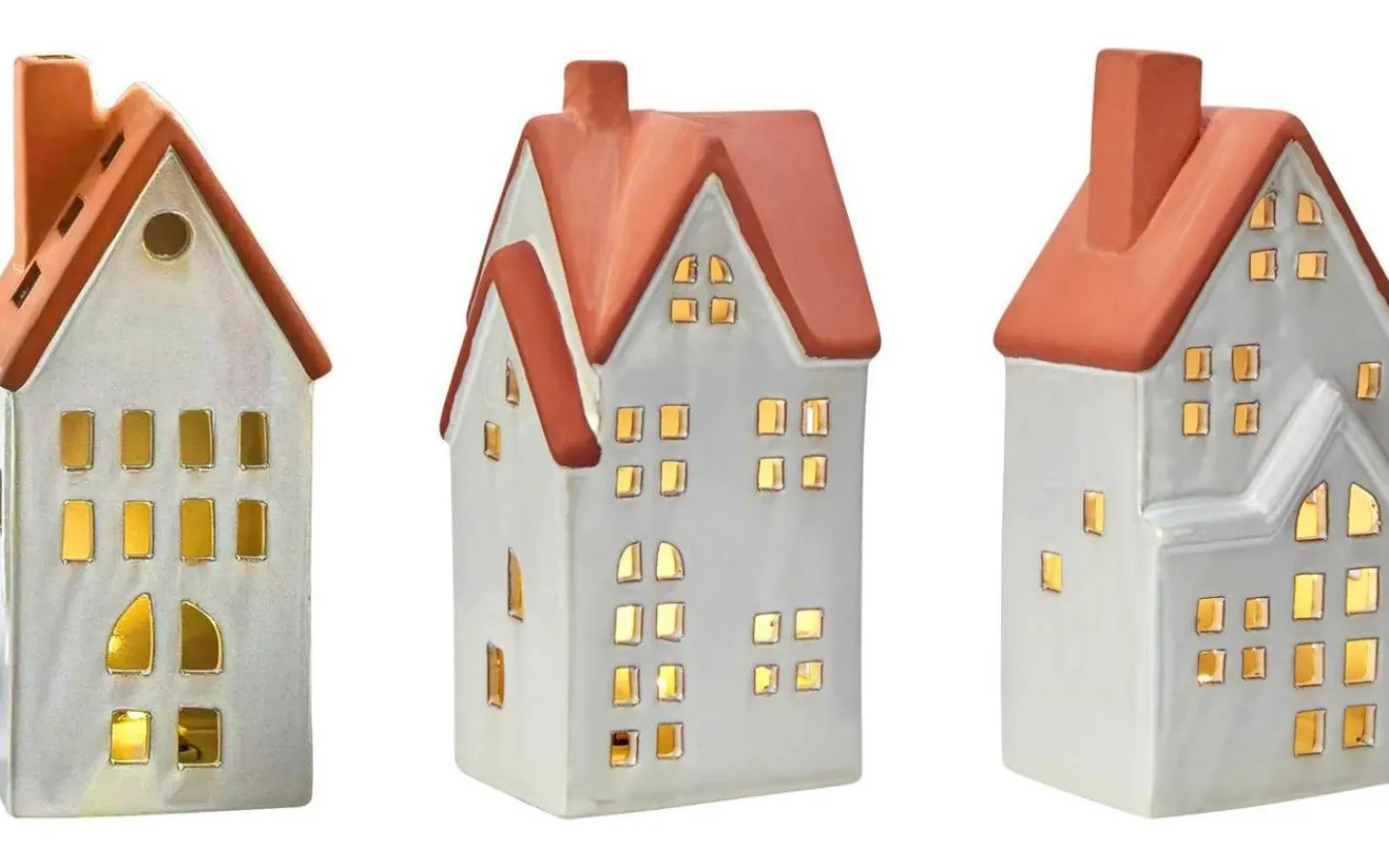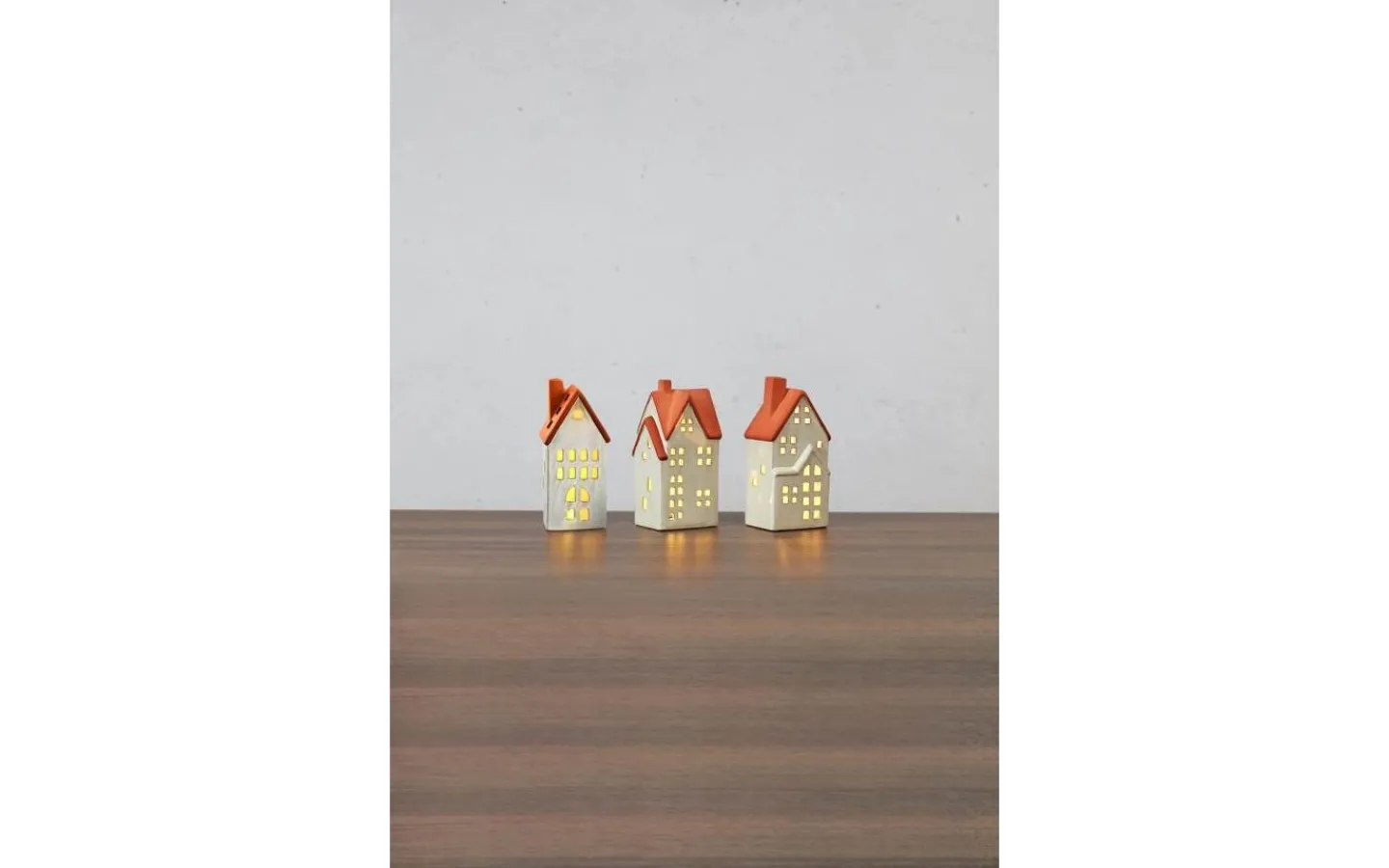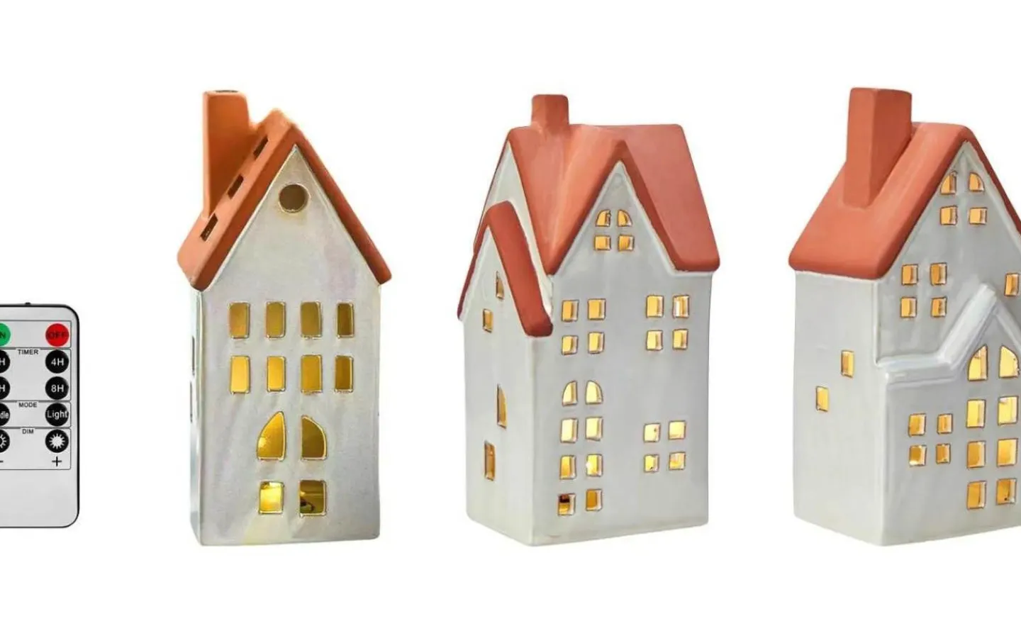 Molton bordsdekoration från Markslöjd. 3-set med hus i keramik. Vita med brunt tak. Höjd på hus, 17.8cm, 17.5cm och 17.3cm. Inkluderat fjärrstyrda LED värmeljus i 3-pack. Uppladdningsbara värmeljus i plast. 2,4,6 och 8h timerfunktion. Ställbar ljuseffekt, konstant eller flamma. Konstant ljus i 4st dimbara steg. 1m vit USB-C sladd medföljer. Brytare under varje ljus.