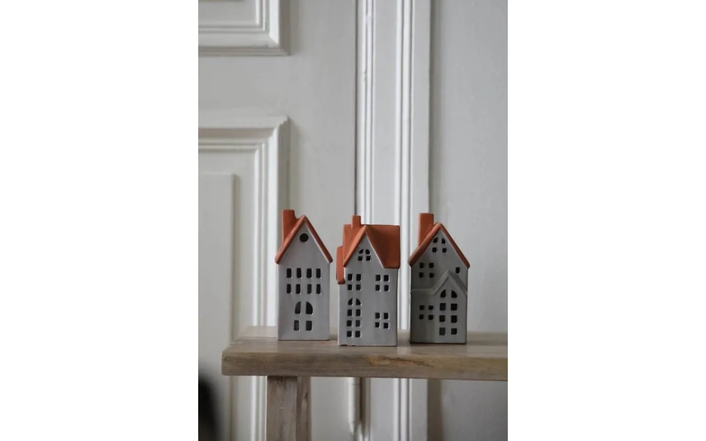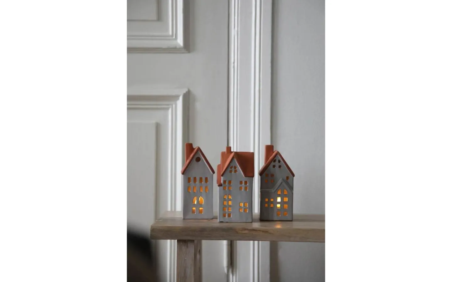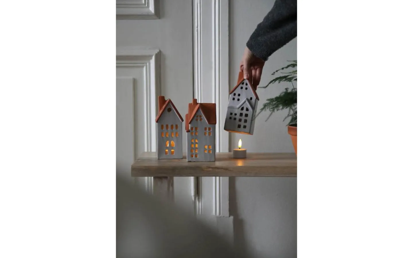Molton bordsdekoration från Markslöjd. 3-set med hus i keramik. Vita med brunt tak. Höjd på hus, 17.8cm, 17.5cm och 17.3cm. Inkluderat fjärrstyrda LED värmeljus i 3-pack. Uppladdningsbara värmeljus i plast. 2,4,6 och 8h timerfunktion. Ställbar ljuseffekt, konstant eller flamma. Konstant ljus i 4st dimbara steg. 1m vit USB-C sladd medföljer. Brytare under varje ljus.