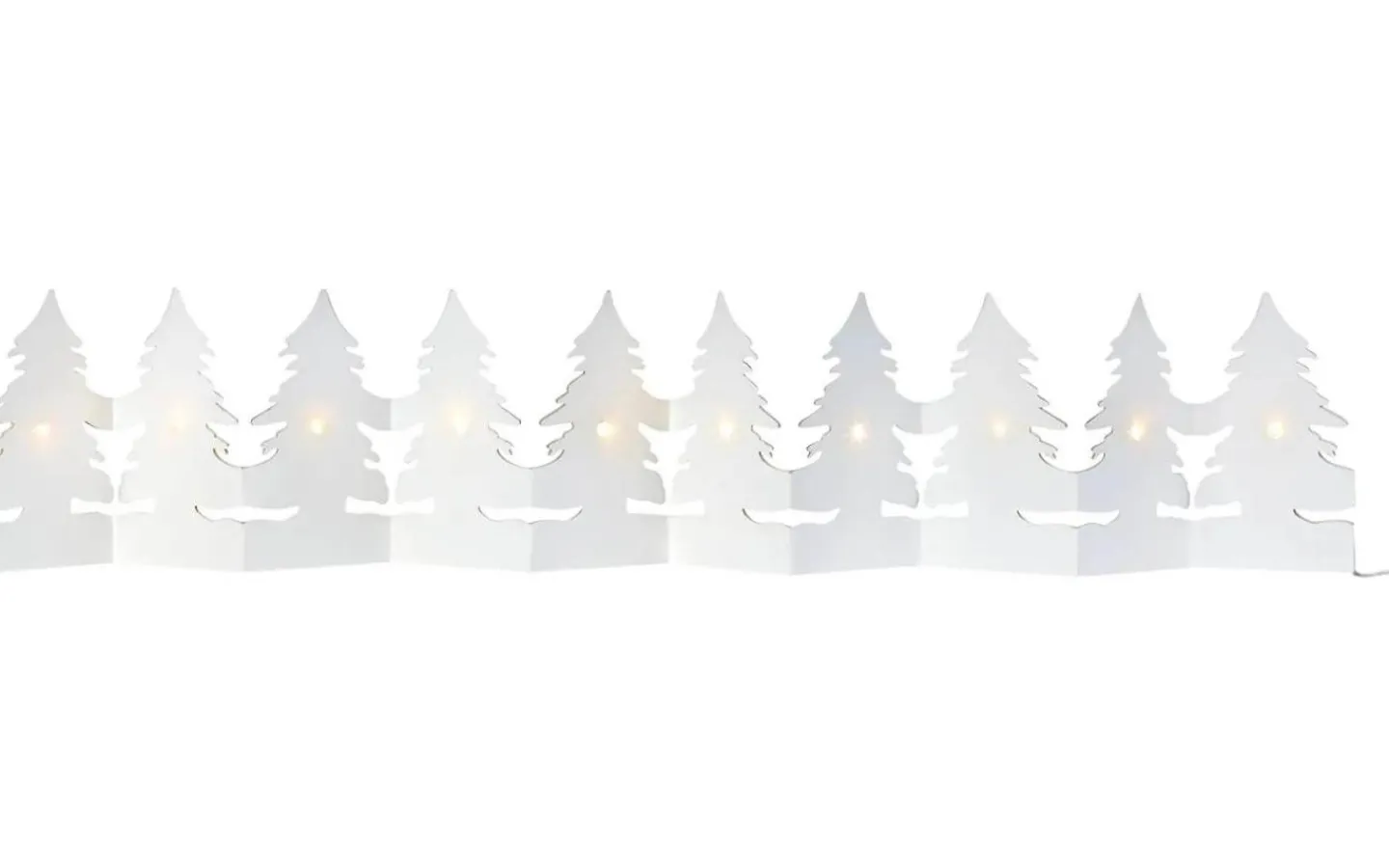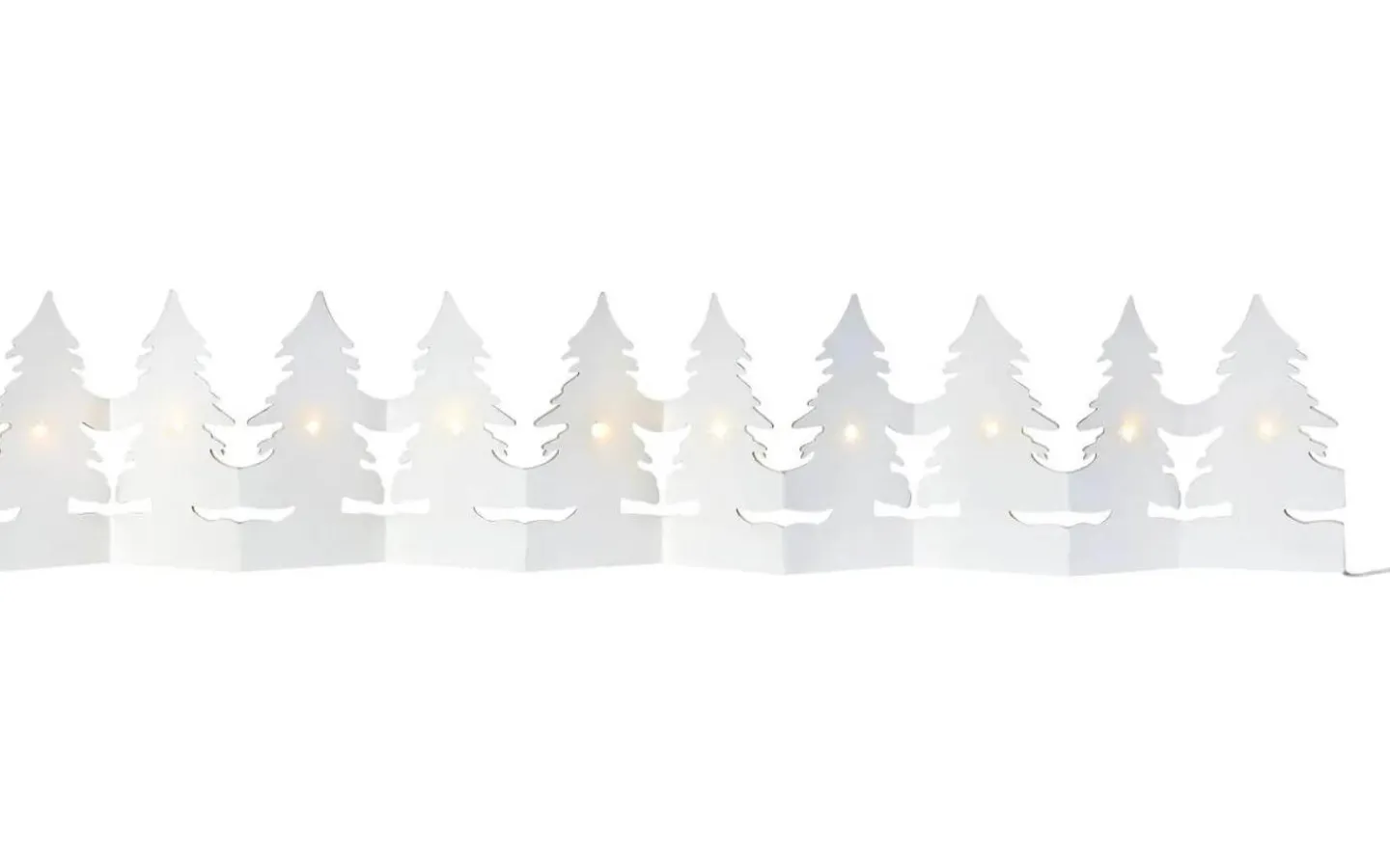 Mysig pappdekoration i form av julgranar som har små LED-dioder som drivs av batterier. Tekniskt: Drivs av 3 st AA-batterier (ingår ej), effekt max 0,6 W. 110 cm bred och 17 cm hög.
