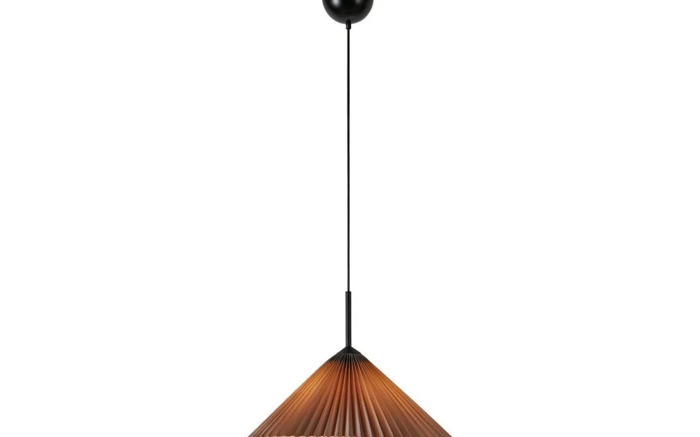 Grå takpendel med plisserad skärm om 50cm. Dekorativ metallknopp i mitten av skärmen. Svart takkopp i metall och svart sladd om 150cm. Passar ovanför ett runt bord skänker ett behagligt allmänljus. Välj gärna en dekorativ ljuskälla som skymtar snyggt under lampskärmen. Finns i flera färger och även som takplafond.