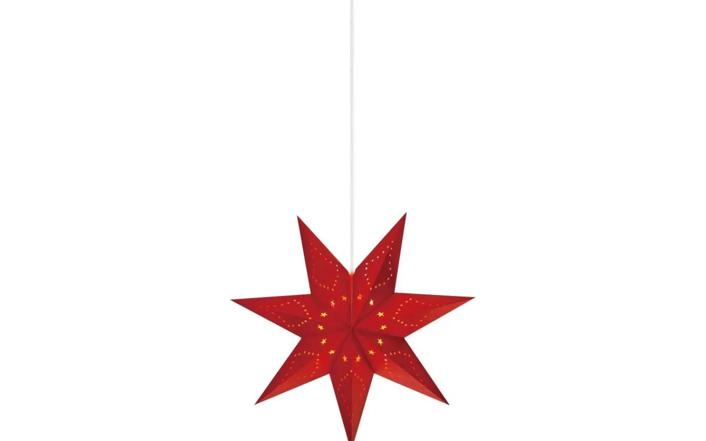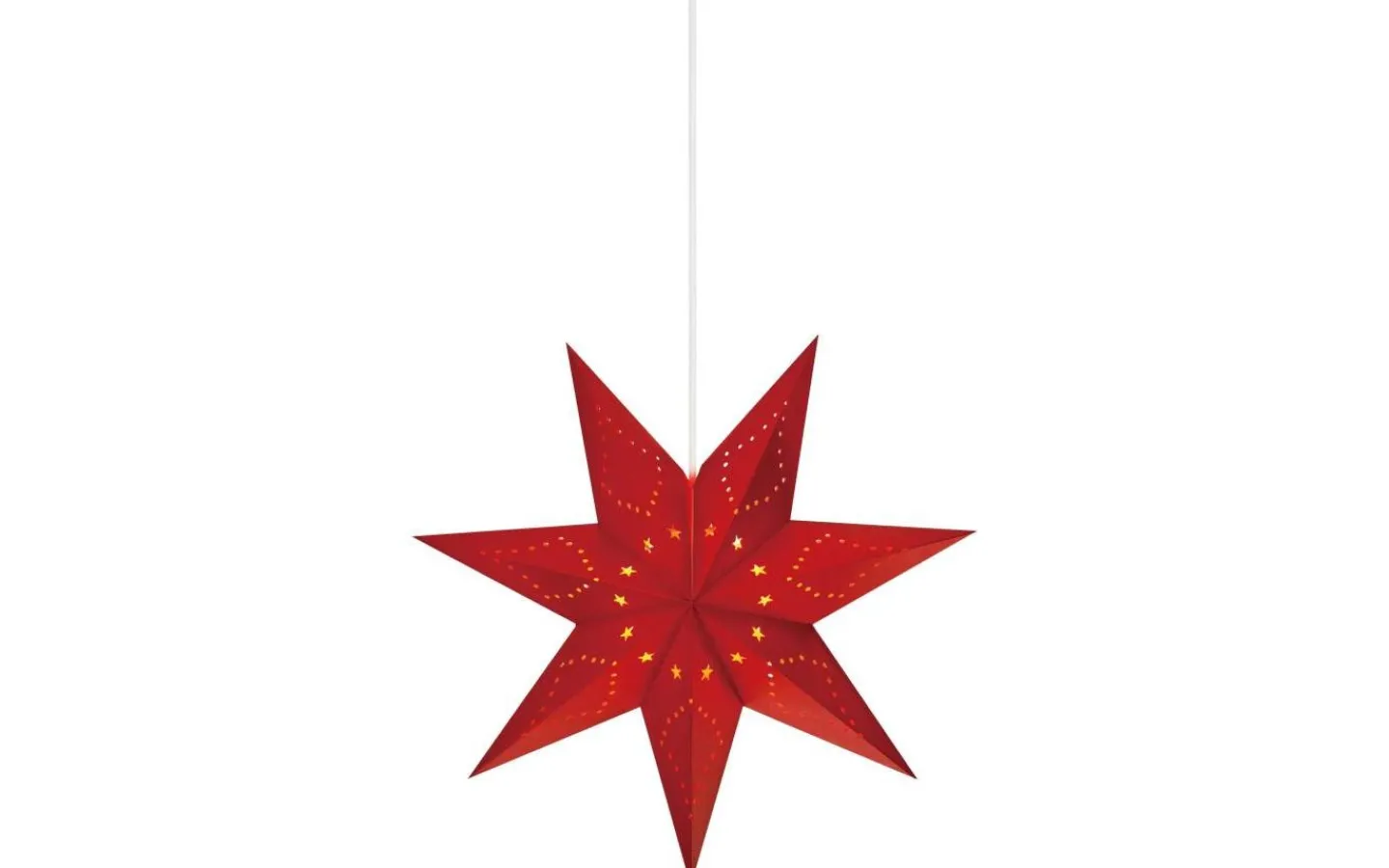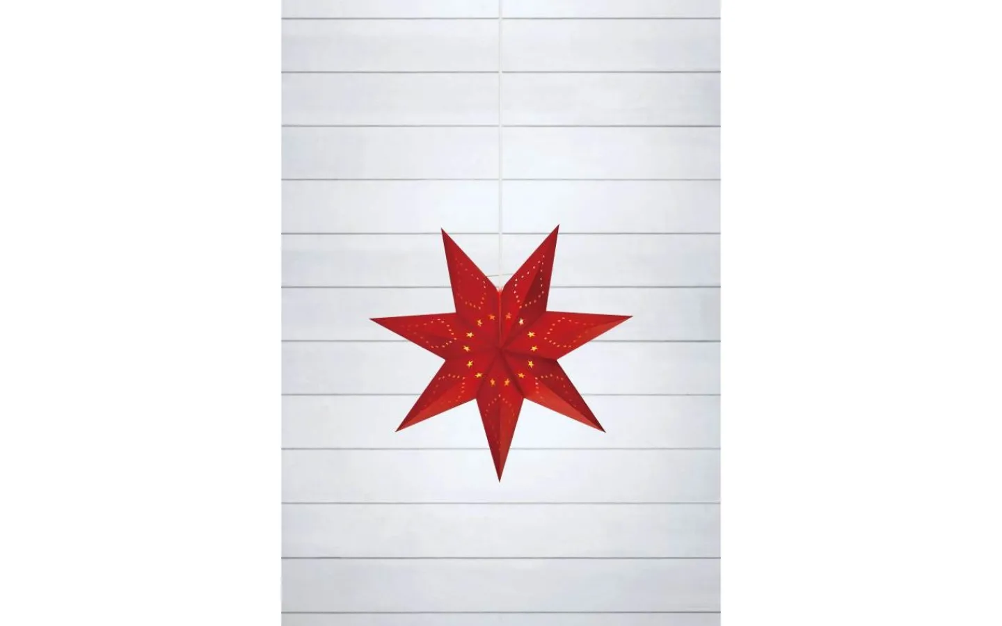 Klassisk julstjärna som mäter 45 cm i diameter. Tillverkad i röd papp med hålmönster. Tekniskt: Stjärnan kräver en glödlampa med liten sockel (E14) om max 25W eller motsvarande i LED, ingår ej. 3,5 m lång sladd med strömbrytare medföljer.